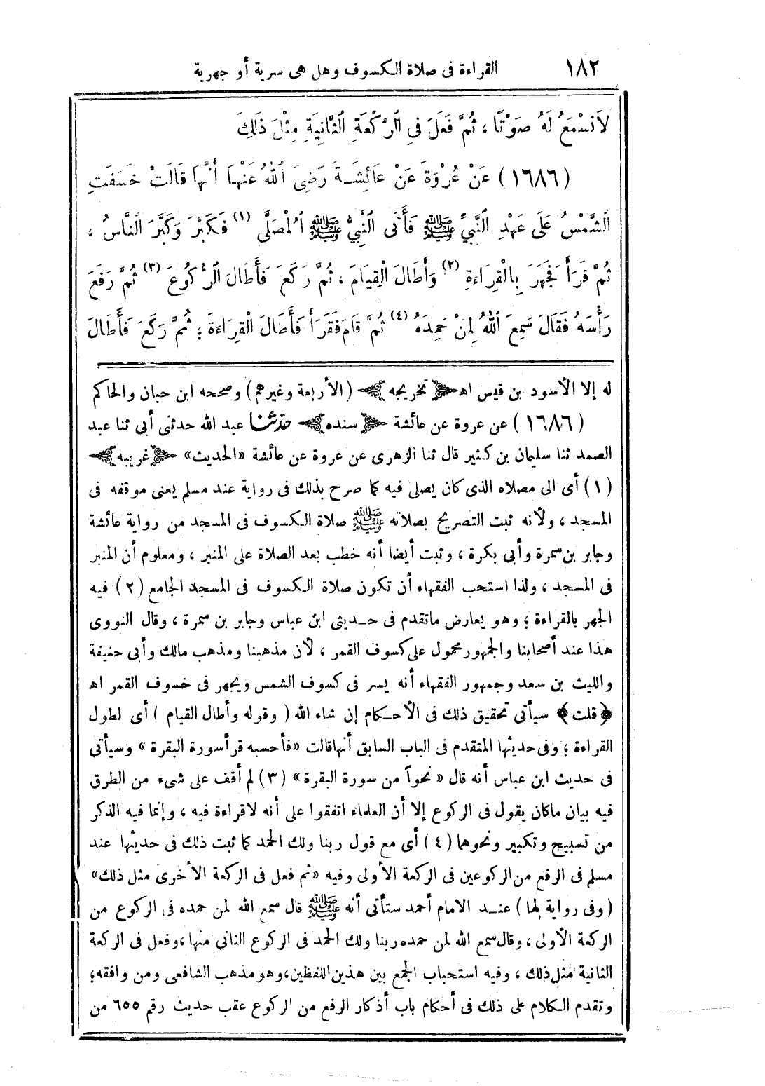 (1686) عن عروة عن عائشة رضى الله عنها أنَّها قالت خسفت الشَّمس على عهد النَّبيِّ (صلى الله عليه وسلم) فأتى النَّبيُّ (صلى الله عليه وسلم) والمصلَّى (1) فكبَّر وكبَّر النَّاس، ثمَّ قرأ فجهر بالقراءة (2) وأطال القيام، ثمَّ ركع فأطال الرُّكوع (3) ثمَّ رفع رأسه فقال سمع الله لمن حمده (4) ثمَّ قام فقرأ فأطال القراءة؛ ثمَّ ركع فأطال