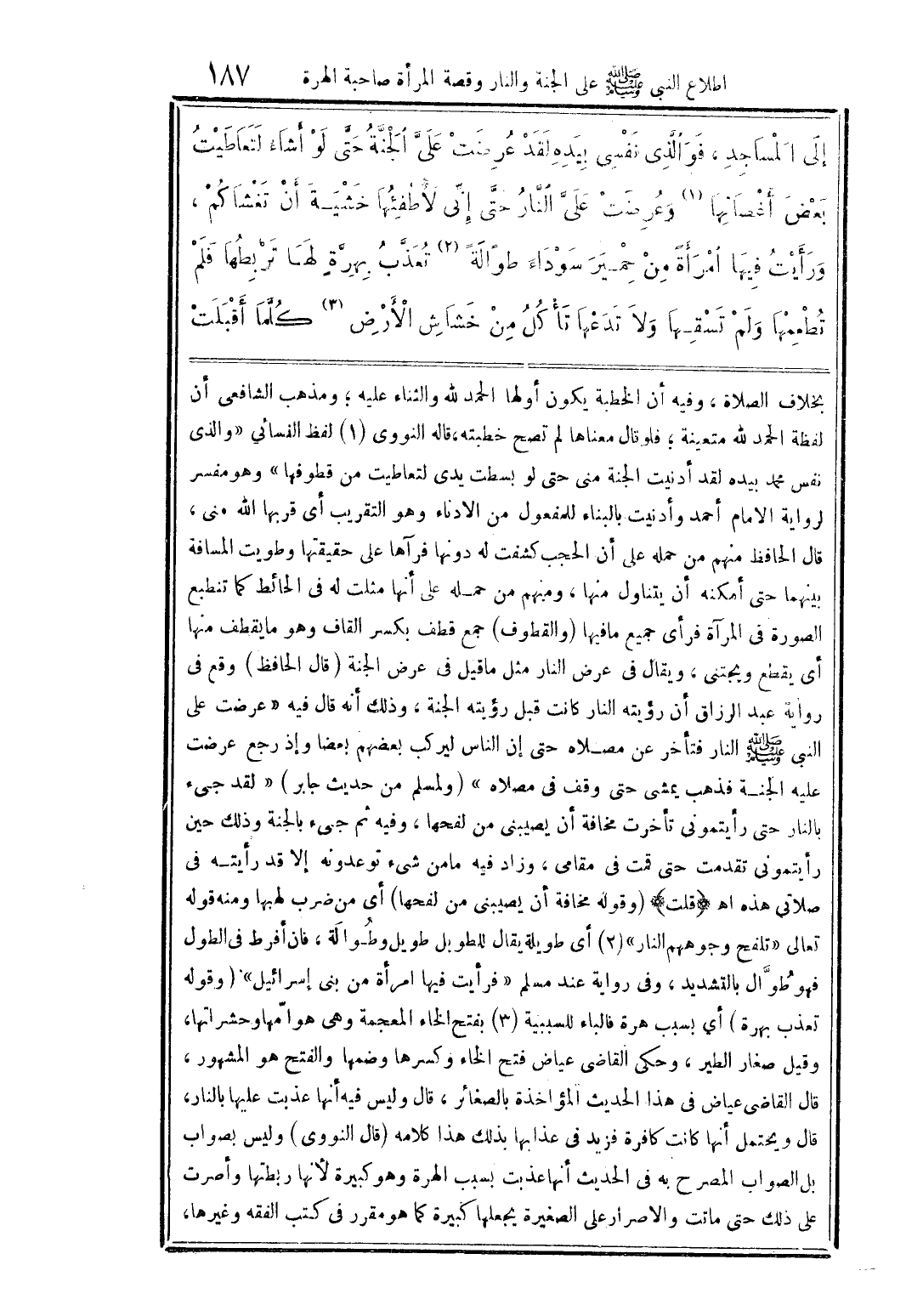 بخلاف الصلاة، وفيه أن الخطبة يكون أولها الحمد لله والثناء عليه؛ ومذهب الشافعي أن لفظه الحمد لله متعينة؛ فلو قال معناها لم تصح خطبته، قاله النووي (1) لفظ النسائي "والذي نفس محمد بيده لقد أدنيت الجنة منى حتى لو بسطت يدى لتعاطيت من قطوفها" وهو مفسر لرواية المام أحمد وأدنيت بالبناء للمفعول من الادناء وهو التقريب أى قربها الله منى، قال الحافظ منهم من حمله على أن الحجب كشفت له دونها فرآها على حقيقتها وطويت المسافة بينهما حتى أمكنه أن يتناول منها، ومنهم من حمله على أنها مثلت له في الحائط كما تنطبع الصورة في المرآة فرأى جميع ما فيها (والقطوف) جمع قطف بكسر القاف وهو ما يقطف منها أي يقطع ويجتنى، ويقال في عرض النار مثل ما قيل في عرض الجنة (قال الحافظ) وقع في رواية عبد الرزاق أن رؤيته النار كان قبل رؤيته الجنة، وذلك أنه قال فيه "عرضت على النبي صلى الله عليه وسلم النار فتأخر عن مصلاه حتى إن الناس ليركب بعضهم بعضاً وإذ رجع عرضت عليه الجنة فذهب يمشى حتى وقف في مصلاه" (ولمسلم من حديث جابر) "لقد جئ بالنار حتى رأيتمونى تأخرت مخافة أن يصيبنى من لفحها، وفيه ثم جئ بالجنة وذلك حين رأتمونى تقدمت حتى قمت فى مقامى، وزاد فيه ما من شيء توعدونه إلا قد رأيته في صلاتي هذه اهـ {قلت} (وقوله مخافة أن يصيبنى من لفحها) أى من ضرب لهبها ومنه قوله تعالى {تلفح وجوههم النار} (2) أى طويلة يقال للطويل طويل وطُوالة، فان أفرط في الطول فهو طُوَّال بالتشديد، وفي رواية عند مسلم "فرأيت فيها امرأة من بنى إسرائيل" (وقوله تعذب بهرة) أي بسبب هرة فالباء للسببية (3) بفتح الخاء المعجمة وهي هوامّها وحشراتها، وقيل صغار الطير، وحكى القاضي عياض فتح الخاء وكسرها وضمها والفتح هو المشهور، قال القاضي عياض في هذا الحديث المؤاخذة بالصغائر، قال وليس فيه أنها عذبت عليها بالنار، قال ويحتمل أنها كانت كافرة فزيد في عذابها بذلك هذا كلامه (قال النووى) وليس بصواب بل الصواب المصرح به في الحديث أنها عذبت بسبب الهرة وهو كبيرة لأنها ربطتها وأصرت على ذلك حتى ماتت والاصرار على الصغيرة يجعلها كبيرة كما هو مقرر في كتب الفقه وغيرها