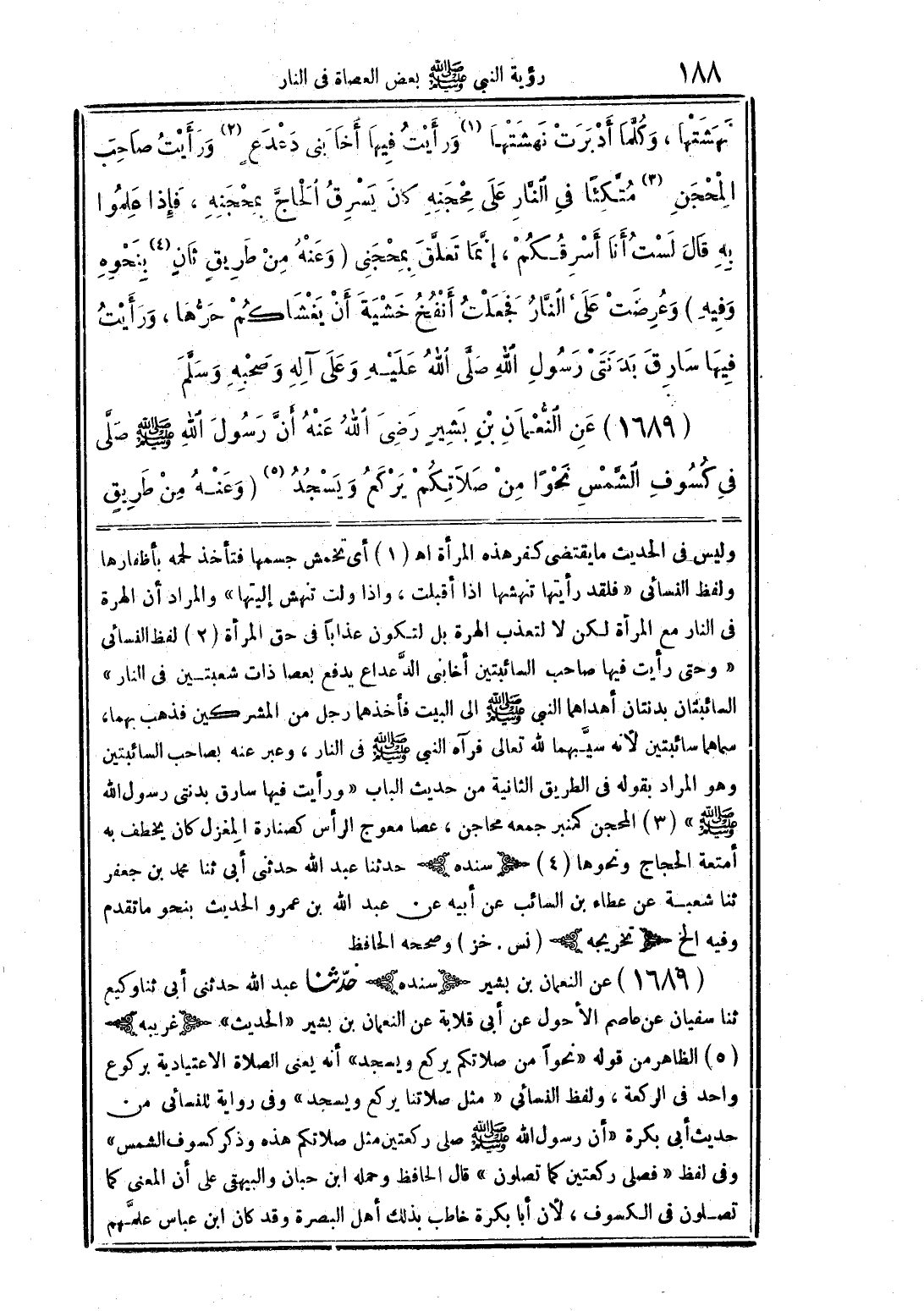 نهشتها، وكلما أدبرت نهشتها (1) ورأيت فيها أخا بنى دعدعٍ (2) ورأيت صاحب المحجن (3) متكئًا فى النَّار على محجنه كان يسرق الحاجَّ بمحجنه، فإذا علموا به قال لست أنا أسرقكم، إنَّما تعلَّق بمحجنى (وعنه من طريقٍ ثانٍ (4) بنحوه وفيه) وعرضت على النَّار فجعلت أنفخ خشية أن يغشاكم حرُّها، ورأيت فيها سارق بدنتى رسول الله صلَّى الله عليه وعلى آله وصحبه وسلَّم