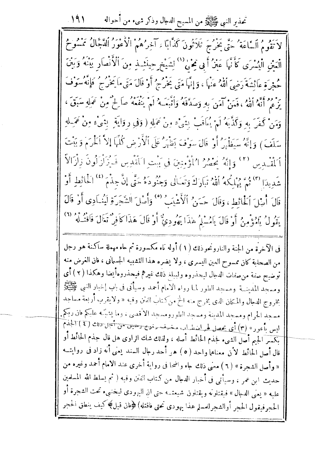 في الآخرة من الجنة والنار ونحو ذلك (1) أوله تاء مكسورة ثم حاء مهملة ساكنة هو رجل من الصحابة كان مسموح العين اليسرى، ولا يضره هذا التشبيه الجسمانى، فان الغرض منه توضيح صفة من صفات الدجال ليحذروه وليبلغ ذلك غيرهم فيحذروه أيضاً وهكذا (2) أى ومسجد المدينة ومسجد الطور لما رواه الامام أحمد وسيأتى في باب إخبار النبى صلى الله عليه وسلم بخروج الدجال والمكان الذي يخرج منه الخ من كتاب الفتن وفيه "ولا يقرب أربعة مساجد مسجد الحرام ومسجد المدينة ومسجد الطور ومسجد الأقصى، وما يشبّه عليكم فان ربكم ليس بأعور" (3) أى يحصل لهم اضطراب مخيف وفزع وضيق من أجل ذلك (4) الجذم بكسر الجيم أصل الشيء فجذم الحائط أصله، ولذلك شك الراوى هل قال جذم الحائط أو قال أصل الحائط لأن معناهما واحد (5) هو أحد رجال السند يعنى أنه زاد في روايته "وأصل الشجرة" (6) معنى ذلك جاء واضحاً في رواية أخرى عند الامام أحمد وغيره من حديث ابن عمر، وسيأتى في أخبار الدجال من كتاب الفتن وفيه (ثم يسلط الله المسلمين عليه "يعنى الدجال" فيقتلونه ويقتلون شيعته حتى ان اليهودى ليختبئ تحت الشجرة أو الحجر فيقول الحجر أو الشجر للمسلم هذا يهودى تحتى فاقتله) {فإن قيل} كيف ينطق الحجر