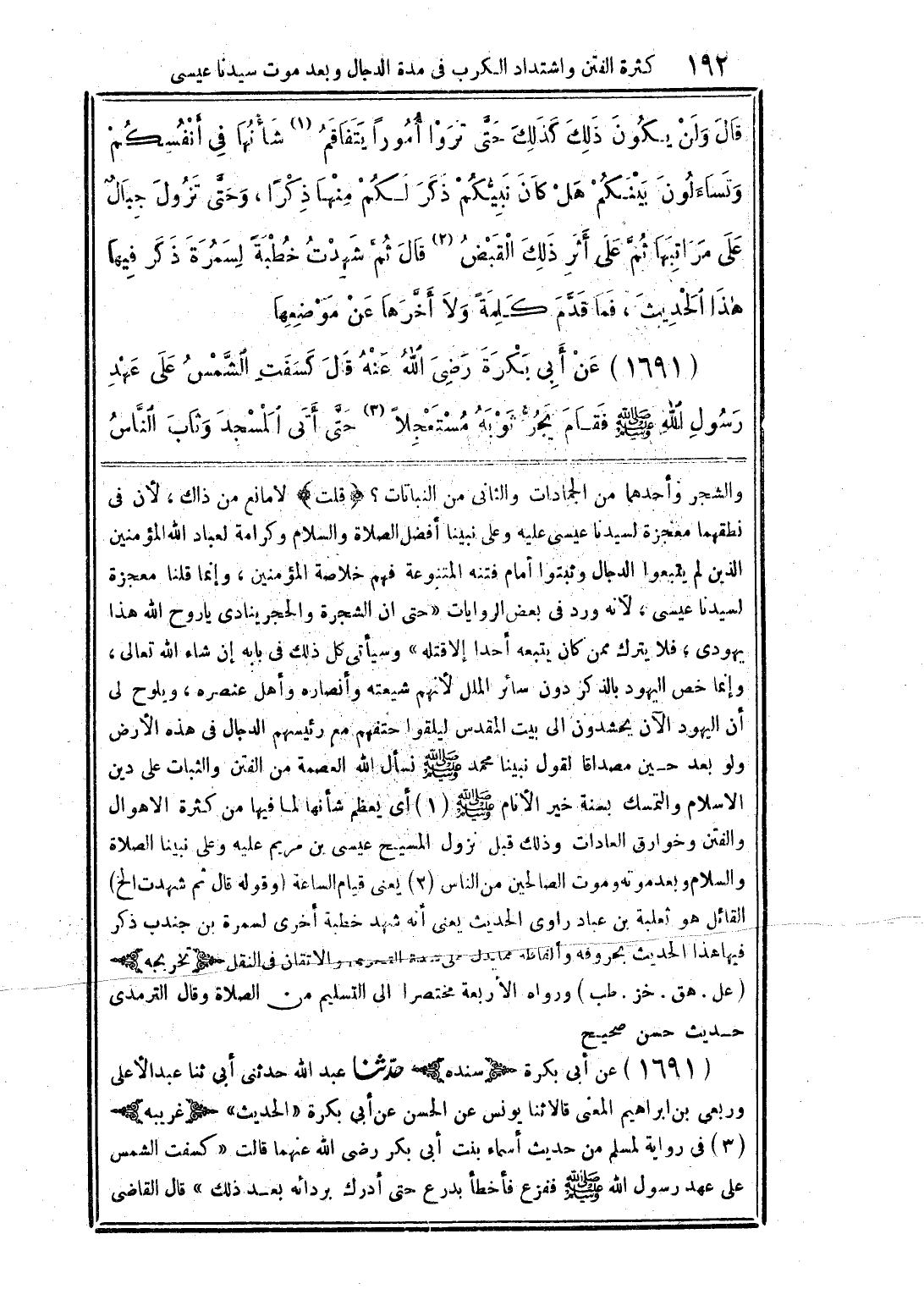 (1691) عن أبى بكرة رضى الله عنه قال كسفت الشَّمس على عهد رسول الله (صلى الله عليه وسلم) فقام يجرُّ ثوبه مستعجلاً (3) حتَّى أتى المسجد وثاب النَّاس