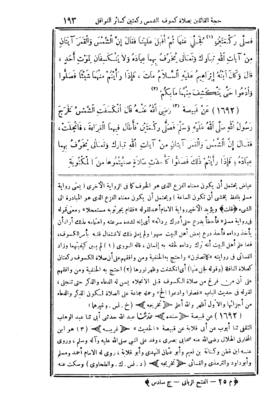 عياض يحتمل أن يكون معناه الفزع الذى هو الخوف كما فى الرواية الأخرى (يعنى رواية مسلم بلفظ يخشى أن تكون الساعة) ويحتمل أن يكون معناه الفزع الذى هو المبادرة الى الشيء {قلت} ويؤيد الأخير رواية الامام أحمد لقوله "فقام يجر ثوبه مستعجلاً" ومعنى قوله في رواية مسلم "فأخطأ بدرع حتى أدرك بردائه" أى إنه لشدة سرعته واهتمامه بذلك أراد أن يأخذ روداءه فأخذ درع بعض أهل البيت سهواً ولم يعلم ذلك لاشتغال قلبه بأمر الكسوف، فلما علم أهل البيت أنه ترك رداءه لحقه به إنسان، قاله النووى (1) لم يبين كيفيتهما وزاد النسائى في روايته "كما تصلون" واحتج به الحنفية ومن وافقهم على أن صلاة الكسوف ركعتان كصلاة النافلة (وقوله فجلى عنها) أى انكشف وظهر نورها (2) احتج به الحنفية ومن وافقهم على أن من فرغ من صلاة الكسوف قبل الانجلاء يسن له الدعاء والذكر حتى تنجلى، لقوله في حديث الباب "فصلوا وادعوا الخ" وحمله جماعة على الصلاة لكون الذكر والدعاء من أجزائها والأول أظهر والله أعلم {تخريجه} (خ. نس. وغيرهما).