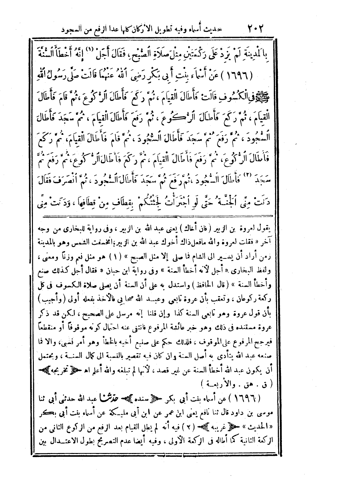 (1696) عن أسماء بنت أبي بكر (سنده) حدقنا عبد الله حدثني أبي ثنا موسى بن داود قال ثنا نافع ابن عمر عن ابن أب أبي مليكة عن أسماء بنت أبي بكر "الحديث" (غريبه) (2) فيه أنه لم يطل القيام بعد الرفع من الركوع الثاني من الركعة الثانية كما أطالع في الركعة الأولى، وفيه أيضاً عدم التصريح بطول الاعتدال بين
