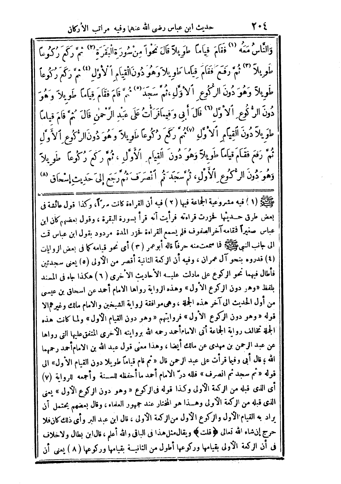 صلى الله عليه وسلم (1) فيه مشروعية الجماعة فيها (2) فيه أن القراءة كانت سرَّا، وكذا قول عائشة في بعض طرق حديثها فحزرت قراءته فرأيت أنه قرأ بسورة البقرة، وقول بعضهم كان ابن عباس صغيرًا فمقامه آخر الصفوف فلم يسمع القراءة فحزر المدة مردود بقول ابن عباس قمت إلى جانب النبي صلى الله عليه وسلم فما سمعت منه حرفًا قاله أبو عمر (3) أي نحو قيامه كما في بعض الروايات (4) قدروه بنحو آل عمران، وفيه أن الركعة الثانية أقصر من الأولى (5) يعني سجدتين فأطال فيهما نحو الركوع على ما دلت عليه الأحاديث الأخرى (6) هكذا جاء في المسند بلفظ " وهو دون الرجوع الأول" وهذه الرواية رواها الإمام أحمد عن إسحاق بن عيسى من أول الحديث إلى آخر الأول" فروايتهم " وهو دون القيام الأول" ولما كانت هذه الجملة تخالف رواية الجماعة أتى الإمام أحمد رحمه الله بروايته الأخرى لمتفق عليها التي رواها عن عبد الرحمن بن مهدي عن مالك أيضًا، وهذا معنى قول عبد الله بن الإمام أحمد رحمهما الله؛ قال أي وفيما قرأت على عبد الرحمن قال "ثم قام قيامًا طويلاً دون القيام الأول" إلى قوله "ثم سجد ثم انصرف" فلله درّ الإمام أحمد ما أحفظه للسنة وأجمعه للرواية (7) أي الذي قبله من الركعة الأولى وكذا قوله في الركوع "وهو دون الركوع الأول" يعني الذي قبله من الركعة الأولى وهذا هو المختار عند جمهور العلماء، وقال بعضهم يحتمل أن يراد به القيام الأول والركوع الأول من الركعة الأولى، قال ابن عبد البر وأي ذلك كان فلا حرج إن شاء الله تعالى (قلت) ويقال مثل هذا في الباقي والله أعلم، قال ابن بطال ولا خلاف في أن الركعة الأولى بقيامها وركوعها أطول من الثانية بقيامها وركوعها (8) يعني أن