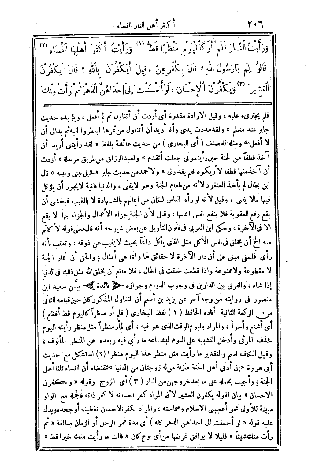 ورأيت النَّار فلم أر كاليوم منظرًا قطُّ ورأيت أكثر أهلها النِّساء قالوا لم يا رسول الله؟ قال بكفرهنّ، قيل أيكفرن بالله؟ قال يكفرن العشير ويكفرن الإحسان، لو أحسنت إلى إحداهنَّ الدَّهر ثمَّ رأت منك