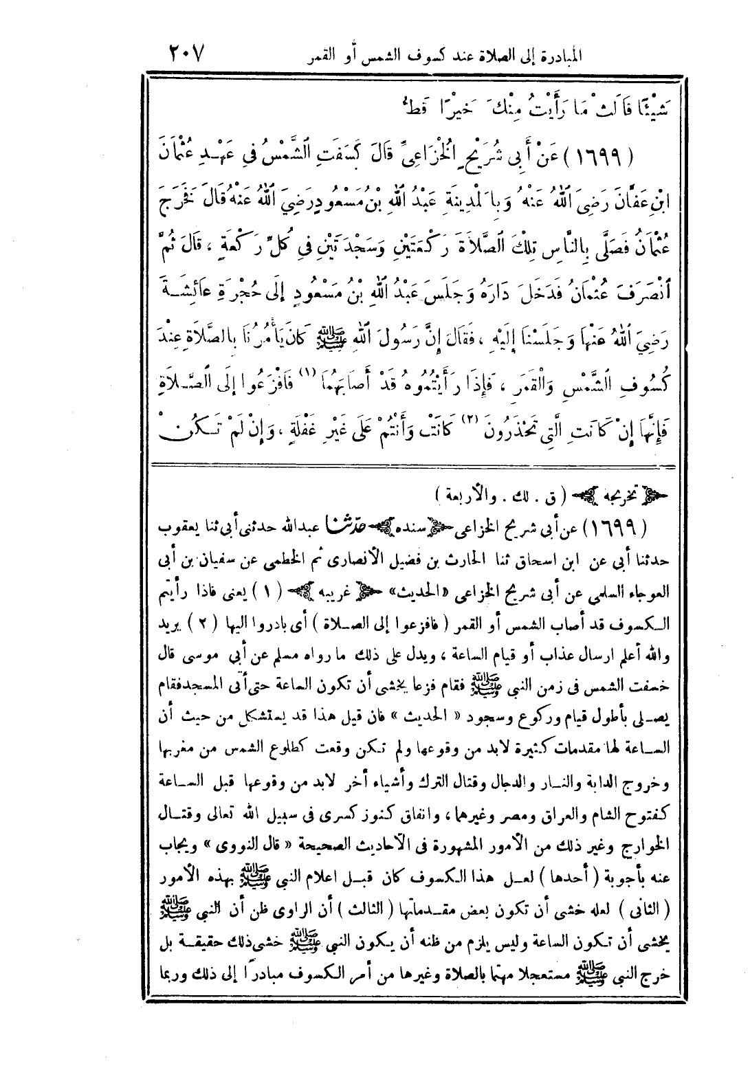 (1699) عن أبي شريح الخزاعيِّ قال كسفت الشَّمس في عهد عثمان ابن عفَّان رضي الله عنه وبالمدينة عبد الله بن مسعود رضي الله عنه قال فخرج عثمان فصلَّى بالنَّاس تلك الصَّلاة ركعتين وسجدتين في كلِّ ركعةٍ، قال ثمَّ انصرف عثمان فدخل داره وجلس عبد الله بن مسعودٍ إلى حجرة عائشة رضي الله عنها وجلسنا إليه، فقال إنَّ رسول الله صلى الله عليه وسلم كان يأمرنا بالصَّلاة عند كسوف الشَّمس والقمر، فإذا رأيتموه قد أصابهما فافزعوا إلى الصَّلاة فإنِّها كانت الَّتي تحذرون كانت وأنتم على غير غفلةٍ، وإن لم تكن