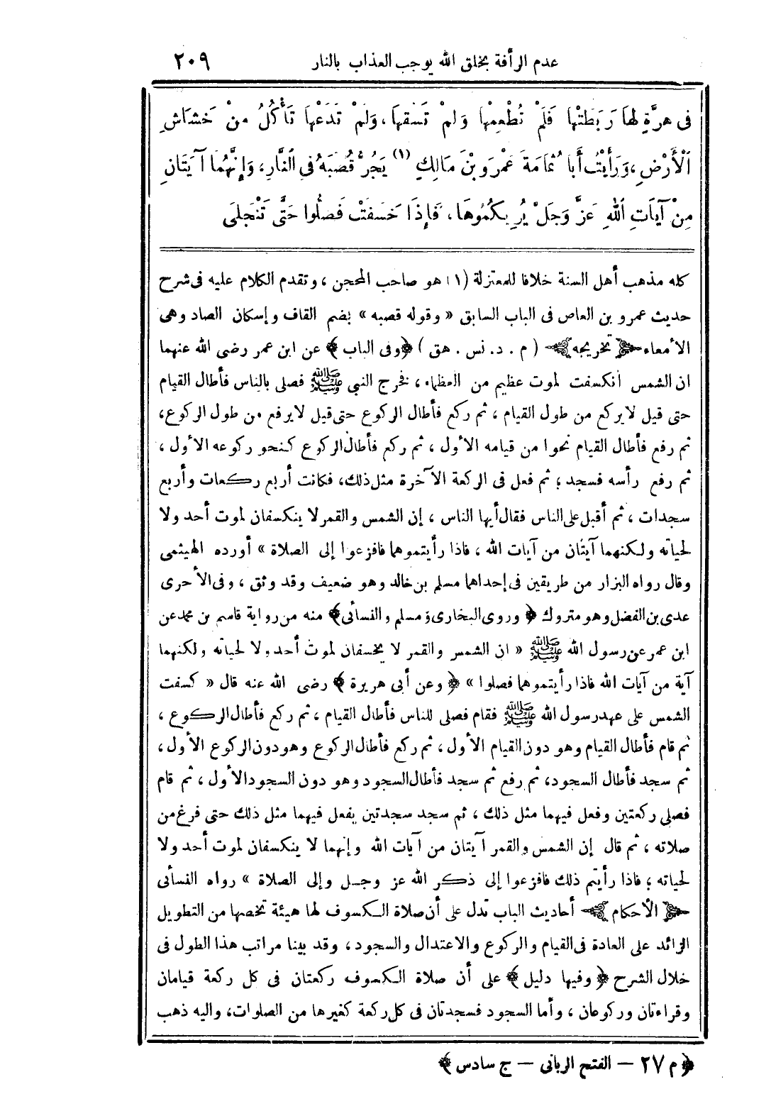 كله مذهب أهل السنة خلافًا للمعتزلة (1) هو صاحب المحجن، وتقدم الكلام عليه في شرح حديث عمرو بن العاص في الباب السابق، "وقوله قصبه" بضم القاف وإسكان الصاد وهي الأمعاء (تخريجه) (م. د. نس. هق) {وفي الباب} عن ابن عمر رضي الله عنهما أن الشمس انكسفت لمون عظيم من العظماء، فخرج النبي صلى الله عليه وسلم فصلى بالناس فأطال القيام حتى قيل لا يركع من طول القيام، ثم ركع فأطال الركوع حتى قيل لا يرفع من طول الركوع، ثم رفع فأطال القيام نحوًا من قيامه الأول، ثم ركع فأطال الركوع كنحو ركوعه الأول، ثم رفع رأسه فسجد؛ ثم فعل في الركعة الآخرة مثل ذلك، فكانت أربع ركعات وأربع سجدات، ثم أقبل على الناس فقال أيها الناس، إن الشمس والقمر لا ينكسفان لموت أحد ولا لحياته ولكنهما آيتان من آيات الله، فإذا رأيتموهما فافزعوا إلى الصلاة" أورده الهيثمي وقال رواه البزار من طريقين في إحداهما مسلم بن خالد وهو ضعيف وقد وثق، وفي الأحرى عدى بن الفضل وهو متروك (وروى البخاري ومسلم والنسائي) منه من رواية قاسم بن محمد عن ابن عمر عن رسول الله صلى الله عليه وسلم "إن الشمس والقمر لا يخسفات لموت أحد ولا لحياته ولكنهما أية من لآيات اله فإذا رأيتموهما فصلوا" (وعن أبي هريرة) رضي الله عنه قال" كسفت الشمس على عهد رسول اله صلى اله عليه وسلم فقام فصلى للناس فأطال القيام، ثم ركع فأطال الركوع، ثم قام فأطال القيام وهو دون القيام الأول، ثم رجع فأطال الرجوع وهو دون الركوع الأول، ثم سجد فأطال السجود، ثم رفع ثم سجد فأطال السجود وهو دون السجود الأول، ثم قام فصلى ركعتين وفعل فيهما مثل ذلك، ثم سجد سجدتين يفعل فيهما مثل ذلك حتى فزع من صلاته، ثم قال إن الشمس والقمر آيتان من آيات الله وإنهما لا ينكسفان لموت أحد ولا لحياته؛ فإذا رأيتم ذلك فافزعوا إلى ذكر الله عز وجل وإلى الصلاة" رواه النسائي (الأحكام) أحاديث الباب تدل على أن صلاة الكسوف لها هيئة تخصها من التطويل الزائد على العادة في القيام والركوع والاعتدال والسجود، وقد بينا مراتب هذا الطول في خلال الشرح (وفيها دليل) على أن صلاة الكسوف ركعتان في كل ركعة قيامان وقراءتان وركوعان، وأما السجود فسجدتان في كل ركعة كغيرها من الصلوات، وإليه ذهب