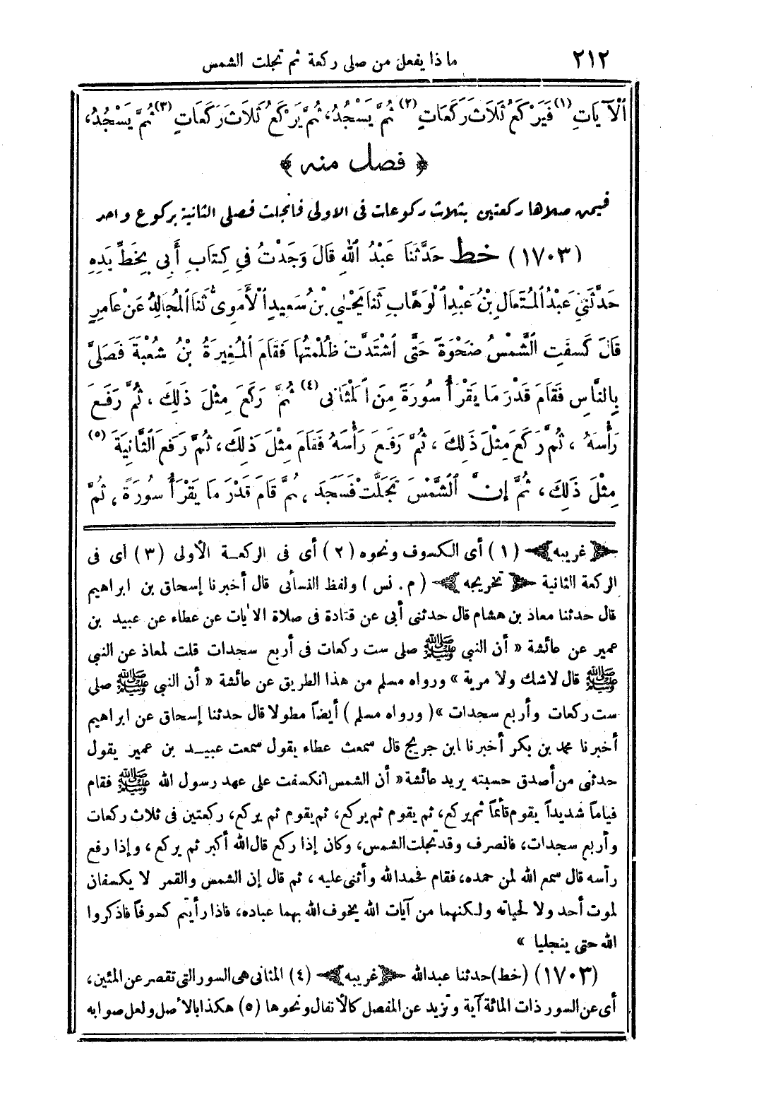 (1703) خط حدَّثنا عبد الله وقال وجدت في كتاب أبي بخطِّ يده حدَّثني عبد المتعال بن عبد الوهَّاب ثنا يحيى بن سعيدٍ الأمويُّ ثنا المجالد عن عامرٍ قال كسفت الشَّمس ضحوة حتَّى اشتدَّت ظلمتها فقام المغيرة بن شعبة فصلَّى بالنَّاس فقام قدر ما يقرأ سورةً من المثاني ثمَّ كع مثل ذلك، ثمَّ رفع رأسه، ثمَّ ركع مثل ذلك، ثمَّ رفع رأسه فقام مثل ذلك، ثمَّ رفع الثَّانية مثل ذلك، ثمَّ إن الشَّمس تجلَّت فسجد، ثمَّ قام قدر ما يقرأ سورةً، ثمَّ