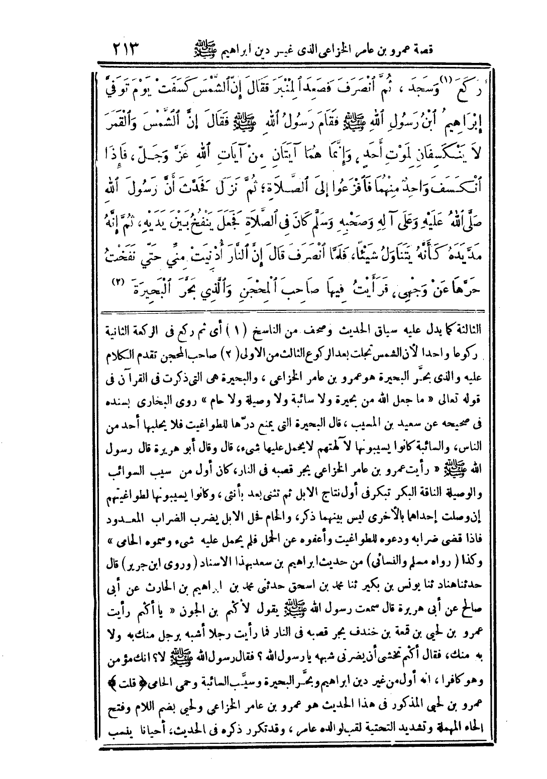 الثالث كما يدل عليه سياق الحديث وصحف من الناسخ (1) أي ثم ركع في الركعة الثانية ركوعًا واحدًا لأن الشمس تجلت بعد الركوع الثالث من الأولى (2) صاحب المحجن تقدم الكلام عليه والذي بحَّر البحيرة هو عمرو بن عامر الخزاعي، والبحيرة هي التي ذكرت في القرآن في قوله تعالى {ما جعل الله من بحيرة ولا سائبة ولا وصيلة ولا حام} روى البخاري بسنده في صحيحه عن سعيد بن المسيب، قال البحيرة التي يمنع در! ها للطواغيت فلا يجلبها أحد من الناس، والسائبة كانوا يسيبونها لآلهتهم لا يجعل عليها شيء، قال وقال أبو هريرة قال رسول الله صلى الله عليه وسلم " رأيت عمر بن عامر الخزاعي يجر قصبه في النار، كان أول من سيب السوائب والوصيلة الناقة البكر تبكر في أول نتاج الإبل ثم ثنى بعد بأنثى، وكانوا يسيبونها لطواغيتهم إن وصلت إحداهما بالأخرى ليس بينهما ذكر، والحام فحل الإبل يضرب الضراب المعدود فإذا قضى ضرابه ودعوه للطواغيت وأعفوه عن الحمل فلم يحمل عليه شيء وسموه الحامي" وكذا (رواه مسلم والنسائي) من حديث إبراهيم بن سعد بهذا الإسناد (وروى ابن جرير) قال حدثنا هناد ثنا يونس بن بكير ثنا محمد بن اسحق حدثني محمد بن إبراهيم بن الحارث عن أبي صالح عن أبي هريرة قال سمعت رسول الله صلى الله عليه وسلم يقول لأكثم بن الجون "يا أكثم رأيت عمرو بن لحيي بن قمعة بن خندف يجر قصبه في النار فما رأيت رجلاً أشبه برجل منك به ولا به منك، فقال أكثم تخشى أن يضرني شبهه يا رسول الله؟ فقال رسول الله صلى اله عليه وسلم لا؟ انك مؤمن وهو كافرًا، أنه أول من غير دين إبراهيم وبحَّر البحيرة وسيَّب السائبة وحمى الحامي (قلت) عمرو بن لحيي المذكور في هذا الحديث هو عمرو بن عامر الخزاعي ولحيي بضم اللازم وفتح الحاء المهملة وتشديد التحتية لقب لوالده عامر، وقد تكرر ذكره في الحديث، أحيانًا ينسب