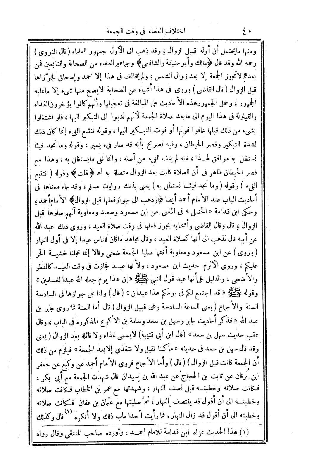 ومنها ما يحتمل أن أوله قبيل الزوال؛ وقد ذهب الى الأول جمهور العلماء (قال النووى) رحمه الله وقد قال {مالك وأبو حنيفة والشافعى} وجماهير العلماء من الصحابة والتابعين فمن بعدهم لا تجوز الجمعة إلا بعد زوال الشمس؛ ولم يخالف في هذا إلا احمد وإسحاق فجوّزاها قبل الزوال (قال القاضى) وروى في هذا أشياء عن الصحابة لا يصح منها شئ إلا ما عليه الجمهور، وحمل الجمهور هذه الأحاديث على المبالغة في تعجيلها وأنهم كانوا يؤخرون الغذاء والقيلولة في هذا اليوم الى ما بعد صلاة الجمعة لأنهم ندبوا الى التبكير اليها، فلو اشتغلوا بشئ من ذلك قبلها خافوا فوتها أو فوت التبكير اليها، وقوله نتتبع الفئ إنما كان ذلك لشدة التبكير وقصر الحيطان، وفيه تصريح بأنه قد صار فئ يسير، وقوله وما نجد فيئًا نتسظل به موافق لهذا، فانه لم ينف الفئ من أصله، وانما نفى ما يستظل به، وهذا مع قصر الحيطان ظاهر في أن الصلاة كانت بعد الزوال متصلة به اهـ {قلت} وقوله (نتبع الفئ) وقوله (وما نجد فيئًا نستظل به) يعنى بذلك روايات مسلم، وقد جاء معناها في أحاديث الباب عند الأمام أحمد أيضًا {وذهب إلى جواز فعلها قبل الزوال} الأمام أحمد؛ وحكى ابن قدامة "الحنبلى" في المعنى عن ابن مسعود وسعيد ومعاوية أنهم صلوها قبل الزوال؛ قال وقال القاضى وأصحابه يجوز فعلها في وقت صلاة العيد، وروى ذلك عبد الله عن أبيه قال نذهب إلى أنها كصلاة العيد، وقال مجاهد ما كان للناس عيداً إلا في أول النهار (وروى) عن ابن مسعود ومعاوية أنهما صليا الجمعة ضحى وقالا إنما عجلنا خشية الحر عليكم، وروى الأثرم حديث ابن مسعود، ولأنها عيد فجازت في وقت العيد كالفطر والأضحى، والدليل على أنها عيد قول النبى صلى الله عليه وسلم "إن هذا يوم جعله الله عيداً للمسلمين" وقوله صلى الله عليه وسلم "قد اجتمع لكم في يومكم هذا عيدان" (قال) ولنا على جوازها في السادسة السنة والأجماع (يعنى الساعة السادسة وهى قبيل الزوال) قال أما السنة فما روى جابر بن عبد الله "فذكر أحاديث جابر وسهل بن سعد وسلمة بن الأكوع المذكورة في الباب، وقال عقب حديث سهل بن سعد" (قال ابن أبى قتيبة) لا يسمى غذاء ولا قائلة بعد الزوال (يعنى وقد قال سهل بن سعد في حديثه "ما كنا نقيل ولا نتغذى إلا بعد الجمعة" فيلزم من ذلك أن الجمعة كانت قبل الزوال) (قال) وأما الأجماع فروى الأمام أحمد عن وكيع عن جعفر ابن بُرقان عن ثابت بن الحجاج عن عبد الله بن سيدان قال شهدت الجمعة مع أبى بكر، فكانت صلاته وخطبته قبل نصف النهار، وشهدتها مع عمر بن الخطاب فكانت صلاته وخطبته إلى أن أقول قد ينتصف النهار، ثم صليتها مع عثمان بن عفان فكانت صلاته وخطبته الى أن أقول قد زال النهار، فما رأيت أحدا عاب ذلك ولا أنكره (¬1) قال وكذلك