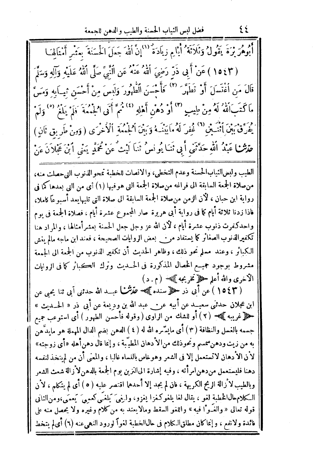 (1543) عن أبى ذر رضي الله عنه عن النبي صلَّى الله عليه وآله وسلَّم قال من اغتسل أو تطهَّر (2) فأحسن الطُّهور ولبس من أحسن ثيابه ومسَّ ما كتب الله له من طيب (3) أو دهن أهله (4) ثمَّ أتى الجمعة فلم يلغ (5) ولم يفرِّق بين اثنين (6) غفر له ما بينه وبين الجمعة الأخرى (ومن طريق ثانٍ) حدّثنا عبد الله حدَّثنى أبى ثنا يونس ثنا ليث عن محمَّدٍ يعنى ابن عجلان عن