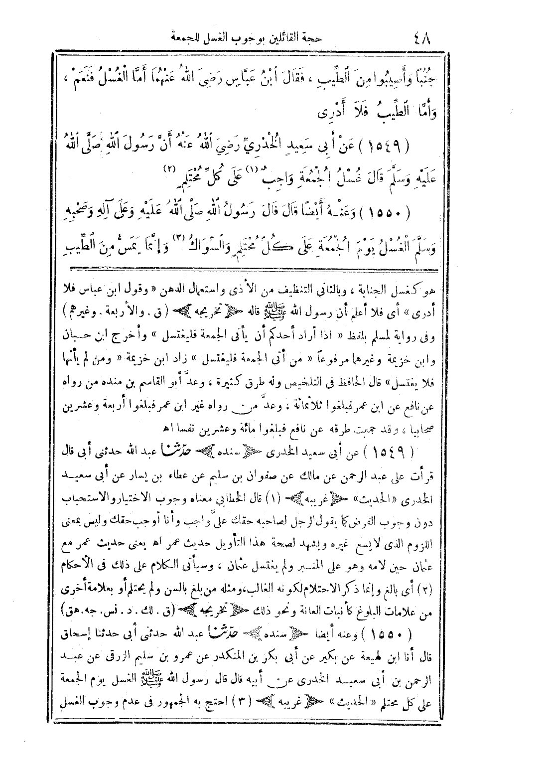 (1549) عن أبى سعيد الخدرى {سنده} حدثنا عبد الله حدثنى أبى قال قرأت على عبد الرحمن عن مالك عن صفوان بن سليم عن عطاء بن يسار عن أبى سعيد الخدرى "الحديث" {غريبه} (1) قال الخطابى معناه وجوب الاختيار والاستحباب دون وجوب الفرض كما يقول الرجل لصاحبه حقك علىَّ واجب وأنا أوجب حقك وليس بمعنى اللزوم الذى لا يسع غيره ويشهد لصحة هذا التأويل حديث عمر اهـ يعنى حديث عمر مع عثمان حين لامه وهو عل المنبر ولم يغتسل عثمان، وسيأتى الكلام على ذلك فى الأحكام (2) أى بالغ وإنما ذكر الاحتلام لكونه الغالب، ومثله من بلغ بالسن ولم يحتلم أو بعلامة أخرى من علامات البلوغ كأنبات العانة ونحو ذلك {تخريجه} (ق. لك. د. نس. جه. هق)