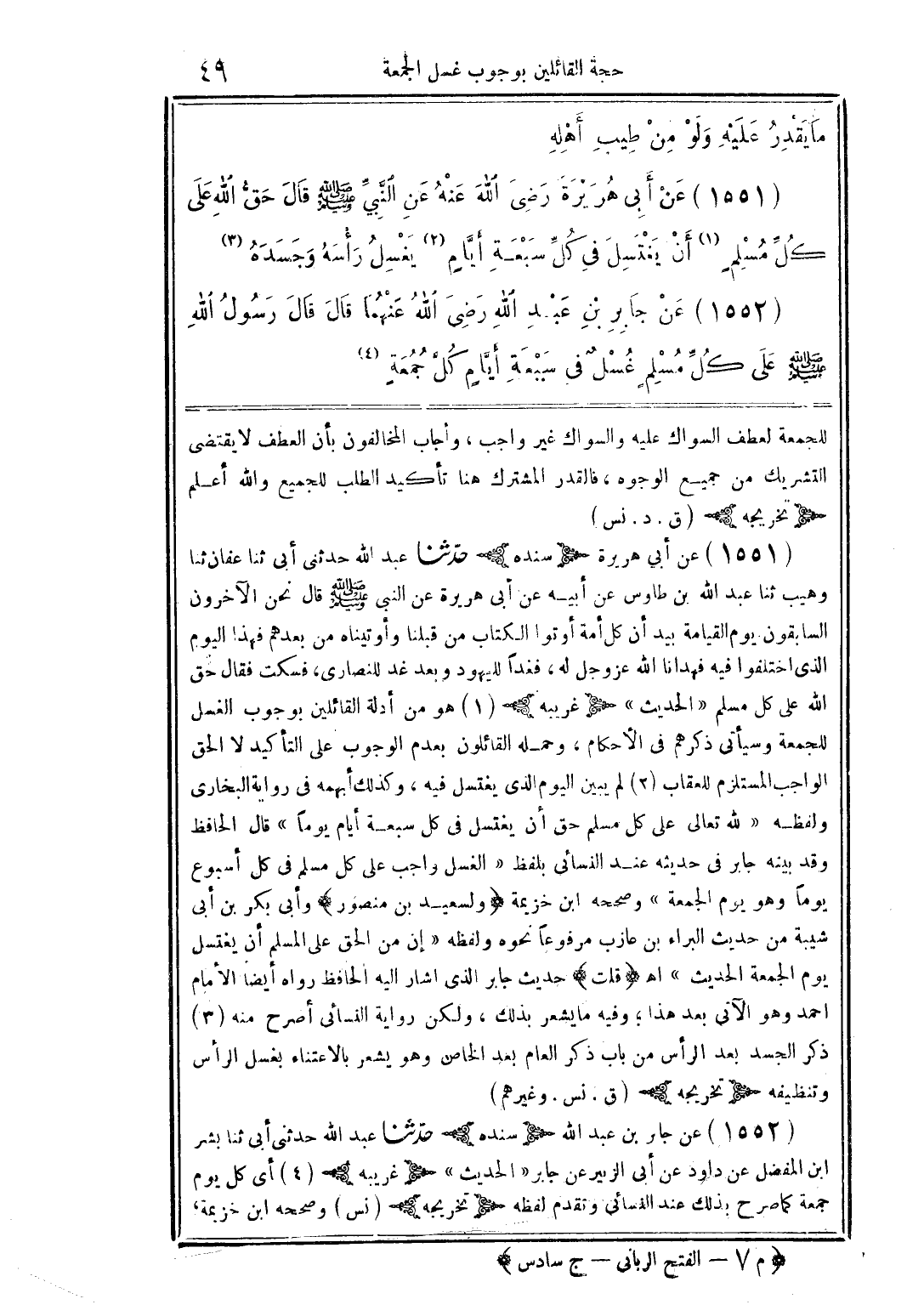 (1551) عن أبى هريرة رضى الله عنه عن النَّبيِّ صلى الله عليه وسلم قال حقُّ الله على كلِّ مسلم (1) أن يغتسل في كلِّ سبعة أيَّام (2) يغسل رأسه وجسده (3)