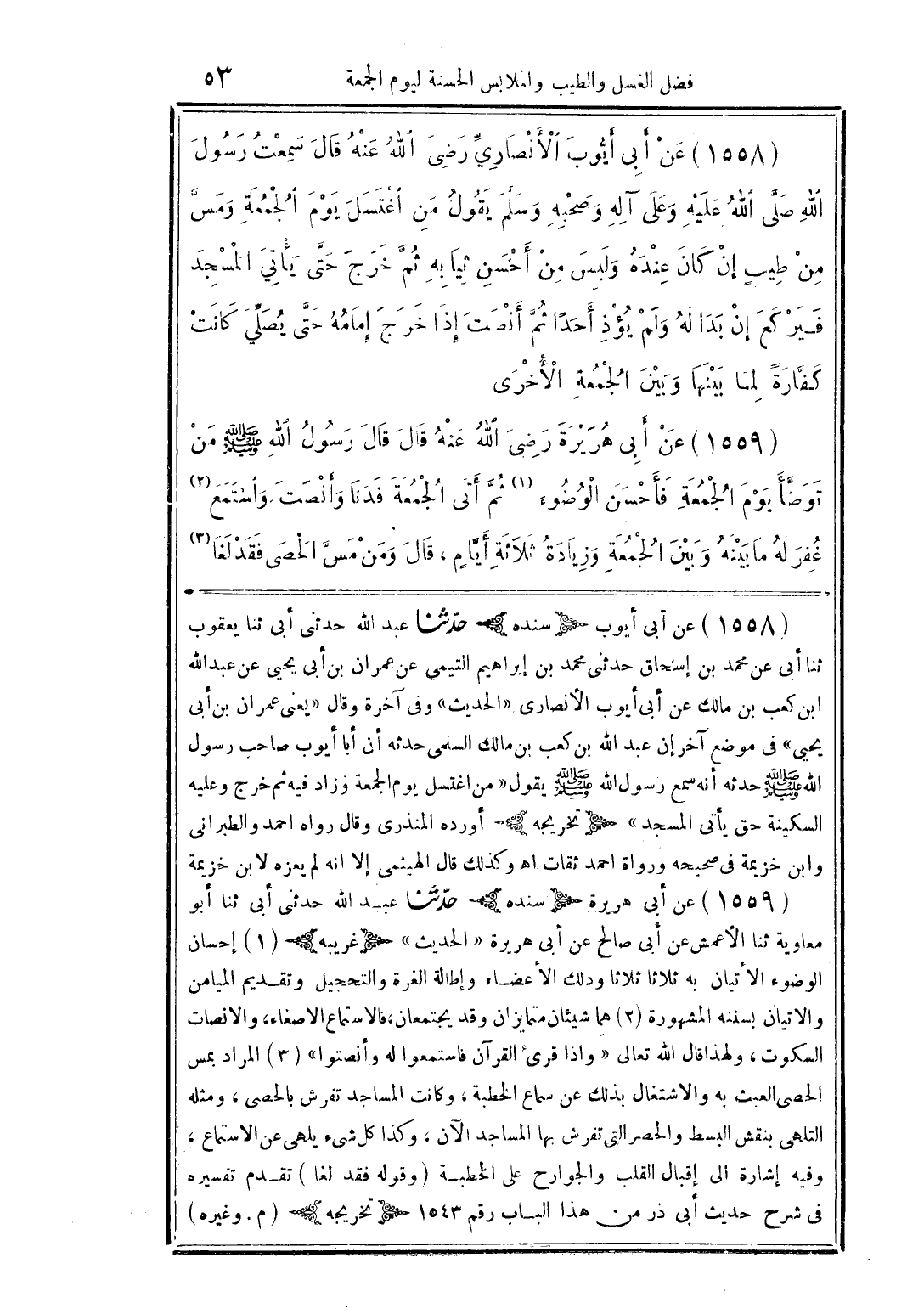 (1558) عن أبي أيُّوب الأنصارىِّ رضى الله عنه قال سمعت رسول الله عليه وعلى آله وصحبه وسلم يقول من اغتسل يوم الجمعة ومسَّ من طيبٍ إن كان عنده ولبس من أحسن ثيابه ثمَّ خرج حتَّى يأتي المسجد فيركع إن بدا له ولم يؤذ أحدًا ثمَّ أنصت إذا خرج إمامه حتَّى يصلِّى كانت كفَّارةً لما بينها وبين الجمعة الأخرى.