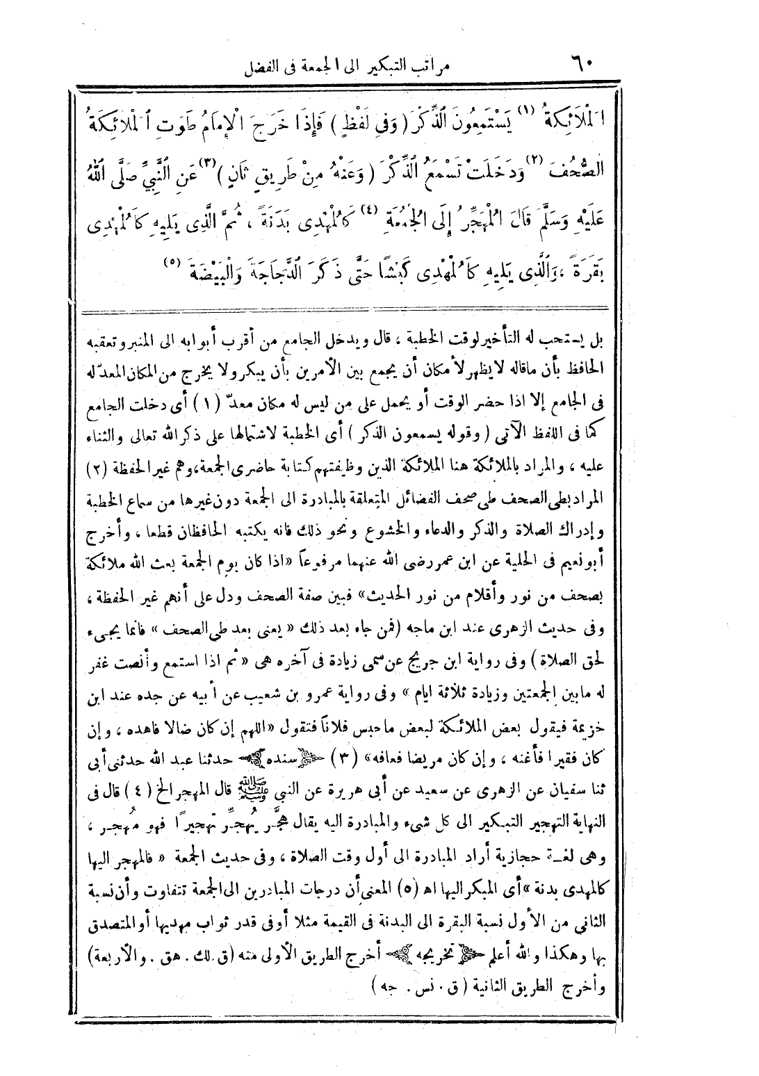الملائكة (1) يستمعون الذِّكر (وفى لفظ) فإذا خرج الإمام طوت الملائكة الصُّحف (2) ودخلت تسمع الذِّكر (وعنه من طريق ثانٍ) (3) عن النَّبيِّ صلَّى الله عليه وسلَّم قال المهجرِّ إلى الجمعة (4) المهدى بدنةً، ثمَّ الَّذى يليه كالمهدى بقرة، والَّذى يليه كالمهدى كبشًا حتَّى ذكر الدَّجاجة والبيضة (5)
