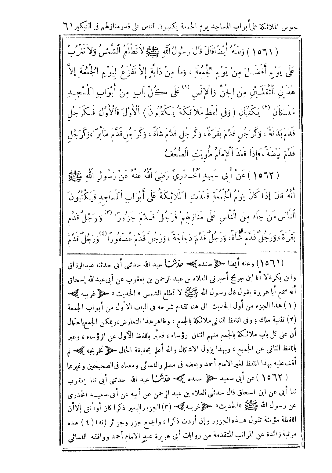 (1561) وعنه أيضًا قال قال رسول الله صلى الله عليه وسلم لا تطلع الشَّمس ولا تغرب على يوم أفضل من يوم الجمعة، وما من دابة إلاَّ تفزع ليوم الجمعة إلاَّ هذين الثَّقلين من الجنِّ والإنس (1) على كلِّ بابٍ من أبواب المسجد ملكان (2) يكتبان (وفى لفظ ملائكة يكتبون) الأوَّل فالأوَّل فكر جلٍ قدم بدنةً. وكرجلٍ قدَّم بقرةً، وكرجلٍ قدَّم شاةً، وكرجلٍ قدَّم طائرًا، كرجل قدَّم بيضةً، فإذا قعد الإمام طويت الصُّحف
