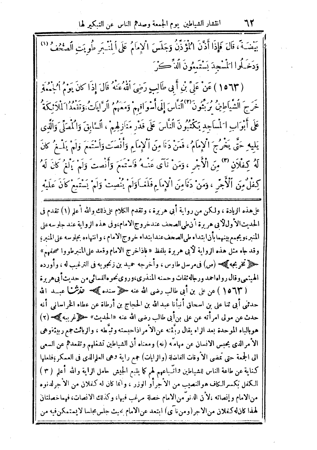 (1563) عن علىِّ بن أ [ى طالبٍ رضى الله عنه قال إذا كان يوم الجمعة خرج الشياطين يربِّثون (2) النَّاس إلى أسواقهم ومعهم الرَّايات، وتقعدا الملائكة على أبواب المساجد يكتبون النَّاس على قدر منازلهم، السَّابق والمصلَّى والذَذى يليه حتَّى يخرج الإمام، فمن دنا من الإمام وأنصت واستمع ولم يلغ كان له كفلان (3) من الأجر، ومن دنا من الإمام فلغا ولم ينصت ولم يستمع كان عليه