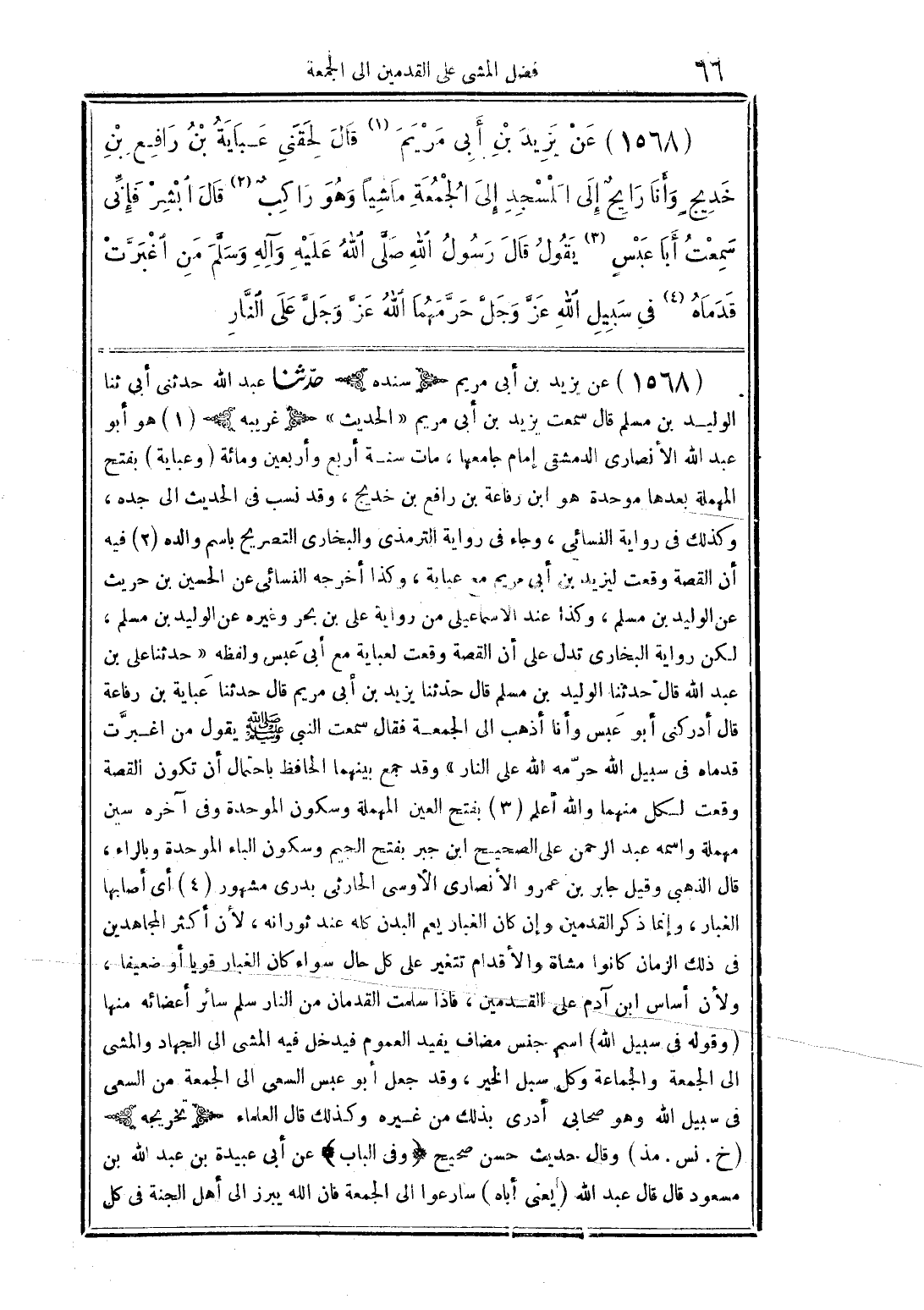 (1568) عن يزيد بن أبي مريم (1) قال لحقنى عباية بن رافع بن خديج وأنا رايحٌ إلى المسجد إلى الجمعة ماشيًا وهو راكب (2) قال ابشر فإنِّى سمعت أبا عبسٍ (3) يقول قال رسول الله صلى الله عليه وآله وسلم من اغبرت قدماه (4) فى سبيل الله عزَّ وجلَّ حرَّمها الله عزَّ وجلَّ على النَّار.