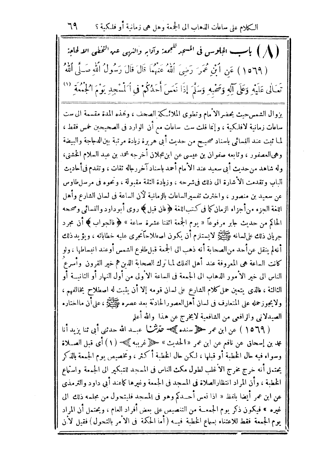 (1569) عن ابن عمر رضى الله عنهما قال قال رسول الله صلى الله تعالى عليه وعلى آله وصحبه وسلَّم إذا نعس أحدكم فى المسجد يوم الجمعة (1)