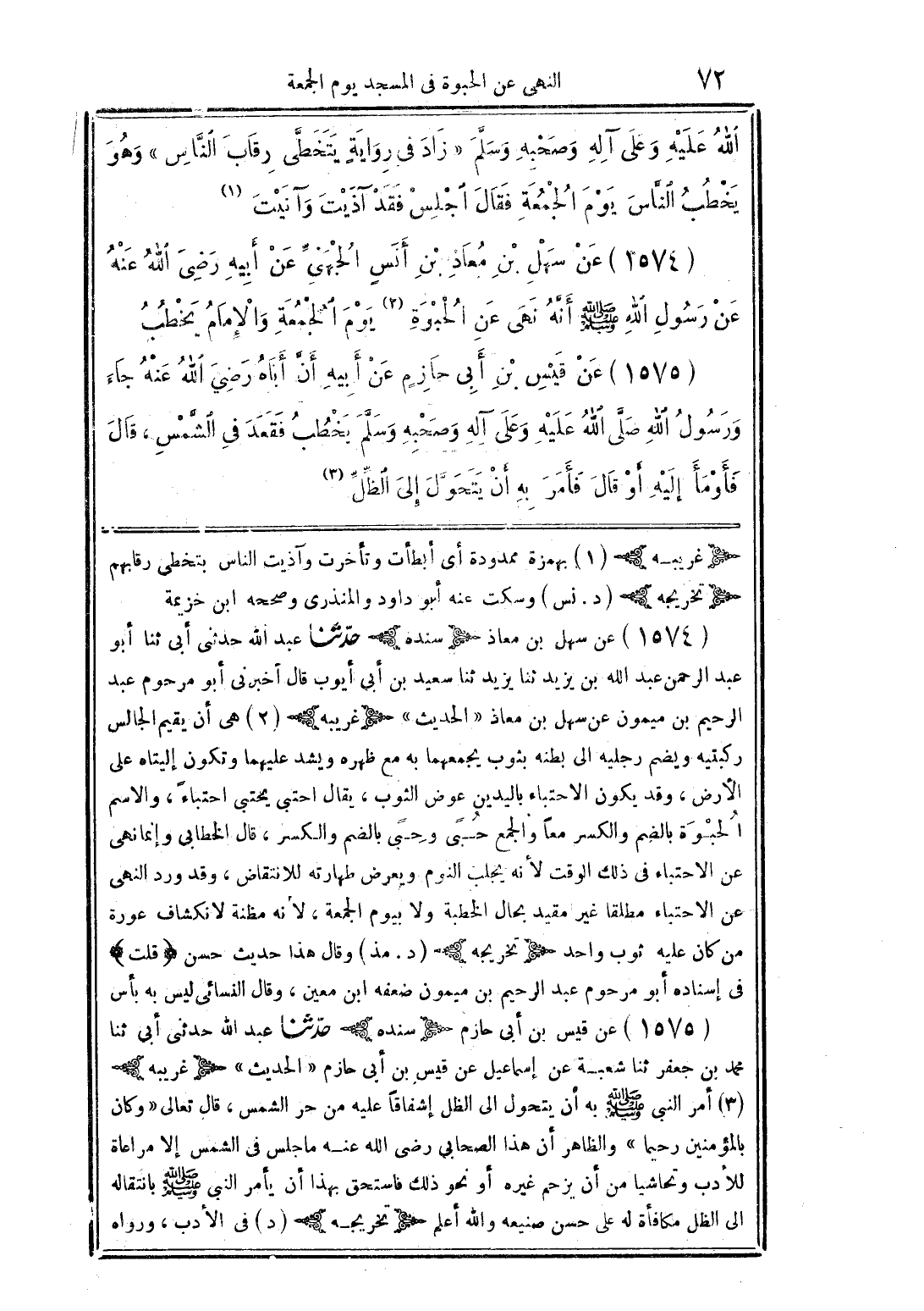 (1574) عن سهل بن معاذ بن أنس الجهنىِّ عن أبيه رضى الله عنه عن رسول الله (صلى الله عليه وسلم) أنَّه نهى عن الحبوة (2) يوم الجمعة والإمام يخطب