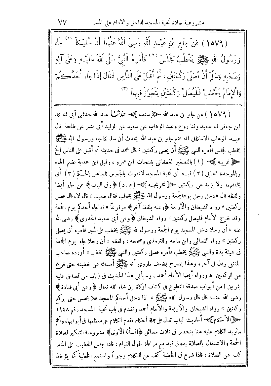 (1579) عن جابر بن عبد الله رضى الله عنهما أن سليكًا (1) جاء ورسول الله (صلى الله عليه وسلم) يخطب فجلس (2) فأمره النَّبي صلَّى الله عليه وعلى آله وصحبه وسلَّم أن يصلِّى ركعتين، ثمَّ أقبل على النَّاس فقال إذا جاء أحدكم والإمام يخطب فليصلِّ ركعتين يتجوَّز فيهما (3)