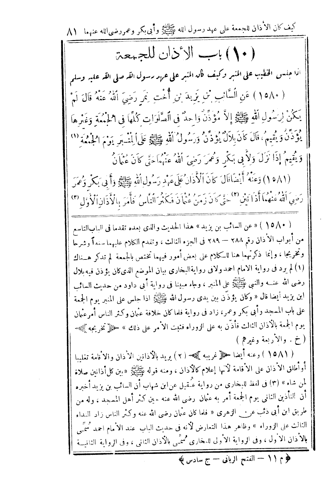 (1581) وعنه أيضًا قال كان الأذان على عهد رسول الله (صلى الله عليه وسلم) وأبى بكر وعمر رضي الله عنهما أذانين (2) حتَّى كان زمن عثمان فكثر النَّاس فأمر بالأذان الأول (3)
