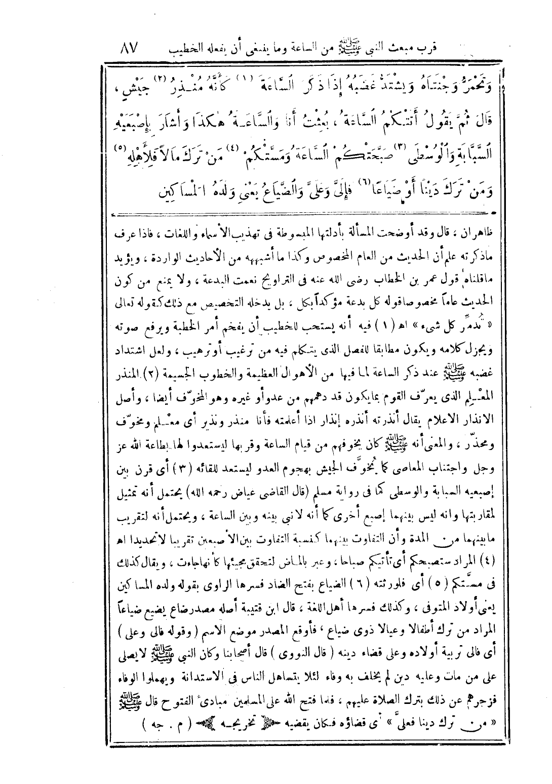 ظاهران، قال وقد أوضحت المسألة بأدلتها المبسوطة فى تهذيب الأسماء واللغات، فاذا عرف ما ذكرته علم أن الحديث من العام المخصوص وكذا ما أشبههه من الأحاديث الواردة، ويؤيد ما قلناه قول عمر بن الخطاب رضى الله عنه فى التراويح نعمت البدعة، ولا يمنع من كون الحديث عاماً مخصوصاً قوله كل بدعة مؤكداً بل، بل يدخله التخصيص مع ذلك كقوله تعالى {تدمر كل شئ} اهـ (1) فيه أنه يستحب للخطيب أن يفخم أمر الخطبة ويرفع صوته ويجزل كلاه ويكون مطابقاً للفصل الذى يتكلم فيه من ترغيب أو ترهيب، ولعل اشتداد غصبه صلى الله عليه وسلم عند ذكر الساعة لما فيها من الأهوال العظيمة والخطوب الجسيمة (2) المنذر المعْلِم الذى يعرّف القوم بما يكون قد دهمهم من عدو أو غيره وهو المخوّف أيضاً، وأصل الانذار الاعلام يقال أنذرته أنذره إنذار اذا أعلمته فأنا منذر ونذير أى معْلم ومخوّف ومحذّر، والمعنى أنه صلى الله عليه وسلم كان يخوفهم من قيام الساعة وقربها ليستعدوا لها بطاعة الله عز وجث واجتناب المعاصى كما يُخوَّف الجيش بهجوم العدو ليستعد للقائه (3) أى قرن بين إصبعيه السبابة والوسطى كما فى رواية مسلم (قال القاضى عياض رحمه الله) يحتمل أنه تمثيل لمقاربتها وانه ليس بينهما إصبع أخرى كما أنه لا نبى بينه وبين الساعة، ويحتمل أنه لتقريب ما بينهما من المدة وأن التفاوت بينهما كنسبة التفاوت بين الأصبعين تقريباً لا تجديداً اهـ (4) المراد ستصبحكم أى تأتيكم صباحاً، وعبر بالماض لتحقق مجيئها كأنها جاءت، ويقال كذلك فى مسَّتكم (5) أى فلورثته (6) الضياع بفتح الضاد فسرها الراوى بقوله ولده المساكين يعنى أولاد المتوفى، وكذلك فسرها أهل اللغة، قال ابن قتيبة أصله مصدر ضاع يضيع ضياعاً المراد من ترك أطفالاً وعيالاً ذوى ضياع، فأوقع المصدر موضع الاسم (وقوله فالى وعلى) أى فالى تربية أولاده وعلى قضاء دينه (قال النووى) قال أصحابنا وكان النبى صلى الله عليه وسلم لا يصلى على من مات وعليه دين لم يخلف به وفاء لئلا يتساهل الناس فى الاستدانة ويهملوا الوفاء فزجرهم عن ذلك بترك الصلاة عليهم، فلما فتح الله على المسلمين مبادئ الفتوح قال صلى الله عليه وسلم "من ترك ديناً فعلىَّ" أى قضاؤه فكان يقضيه {تخريجه} (م. جه)