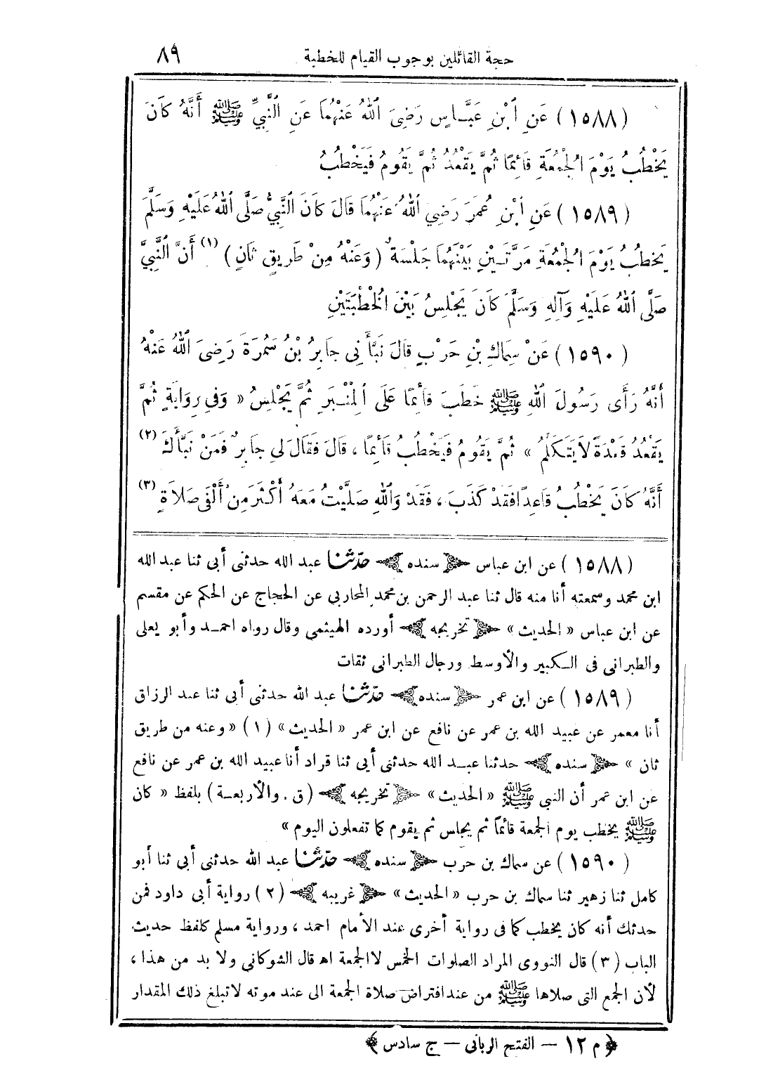 (1589) عن ابن عمر رضي الله عنهما قال كان النَّبيُّ صلَّى الله عليه وسلَّم يخطب يوم الجمعة مرَّتين بينهما جلسة (وعنه من طريقٍ ثانٍ) (1) أنَّ النَّبيَّ صلَّى الله عليه وآله وسلَّم كان يجلس بين الخطبتين.