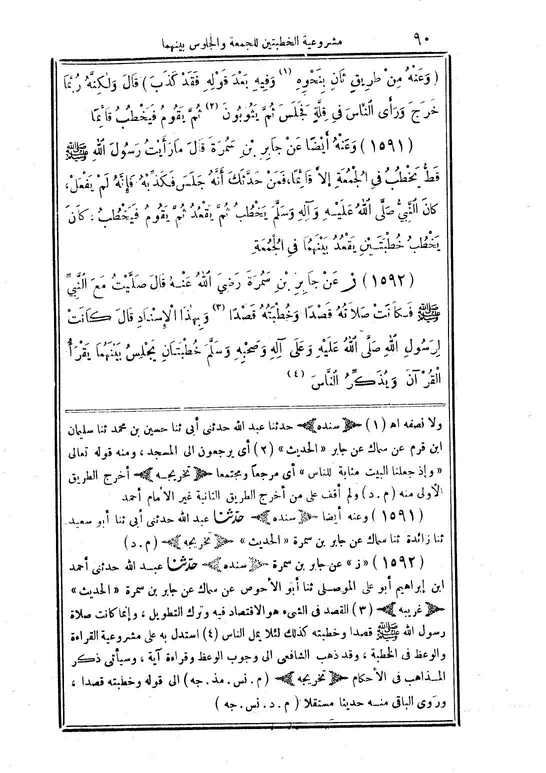 (1592) ز عن جابر بن سمرة رضي الله عنه قال صلَّيت مع النَّبيِّ (صلى الله عليه وسلم) فكانت صلاته قصدًا وخطبته قصدًا (3) وبهذا الإسناد قال كانت لرسول الله صلَّى الله عليه وعلى آله وصحبه وسلَّم خطبتان يجلس بينهما يقرأ القرآن ويذكِّر النَّاس (4)