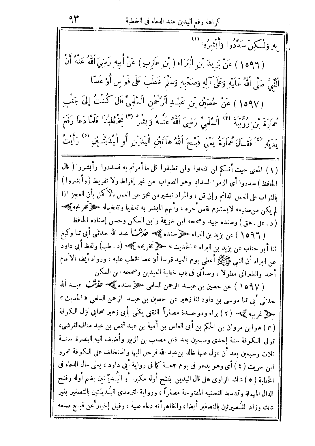 (1597) عن حُصين بن عبد الرَّحمن السَّلميِّ قال كنت إلى جنب عمارة بن رؤيبة (2) السَّلميِّ رضى الله عنه وبشرٌ (3) يخطبنا فلمَّا دعا رفع يديه (4) فقال عمارة يعني قبَّح الله هاتين اليدين أو اليديتين (5) رأيت
