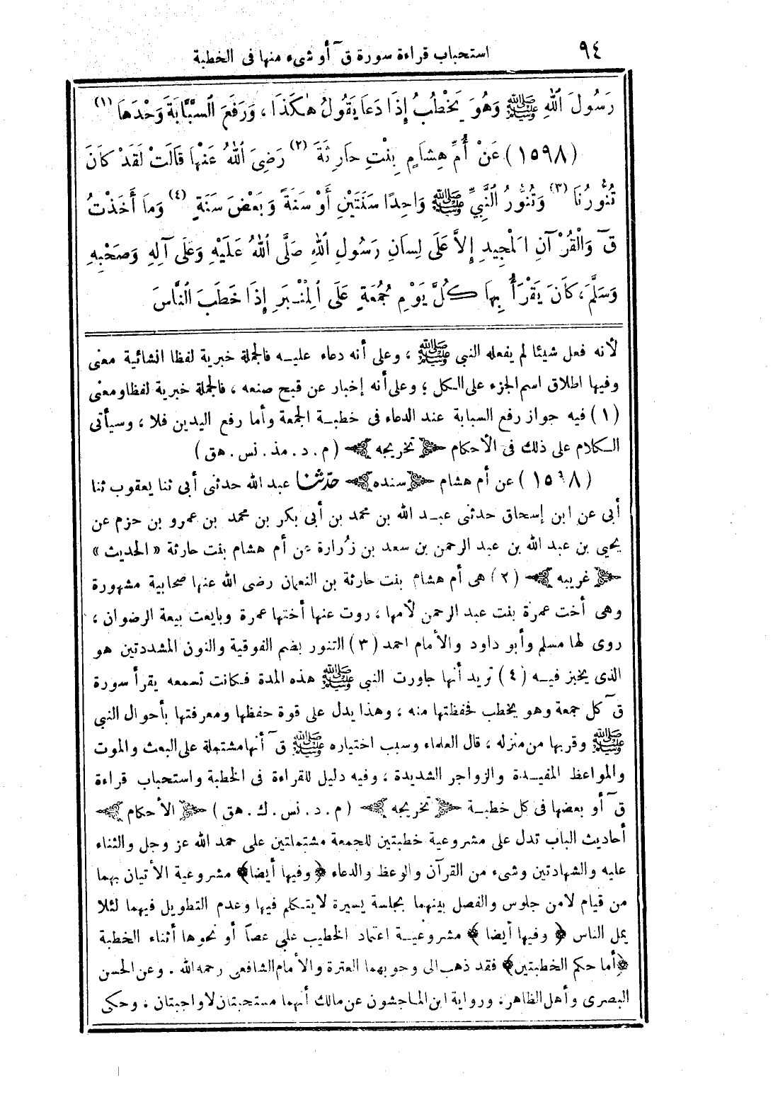 (1598) عن أمِّ هشامٍ بنت حارثة (2) رضى الله عنها قالت لقد كان تنُّورنا (3) وتنُّور النَّبيِّ (صلى الله عليه وسلم) واحدًا سنتين أو سنةً وبعض سنةٍ (4) وما أخذت ق والقرآن المجيد إلاَّ على لسان رسول الله صلَّى الله عليه وعلى آله وصحبه وسلَّم، كان يقرأ بها كلَّ يوم جمعةٍ على المنبر إذا خطب النَّاس