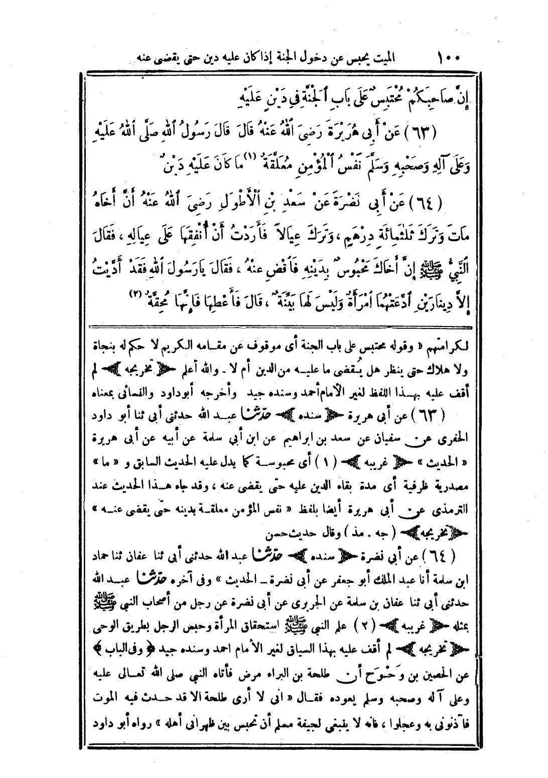 (63) عن أبي هريرة رضي الله عنه قال قال رسول الله صلَّى الله عليه وعلى آله وصحبه وسلَّم نفس المؤمن معلقة (1) ما كان عليه دين