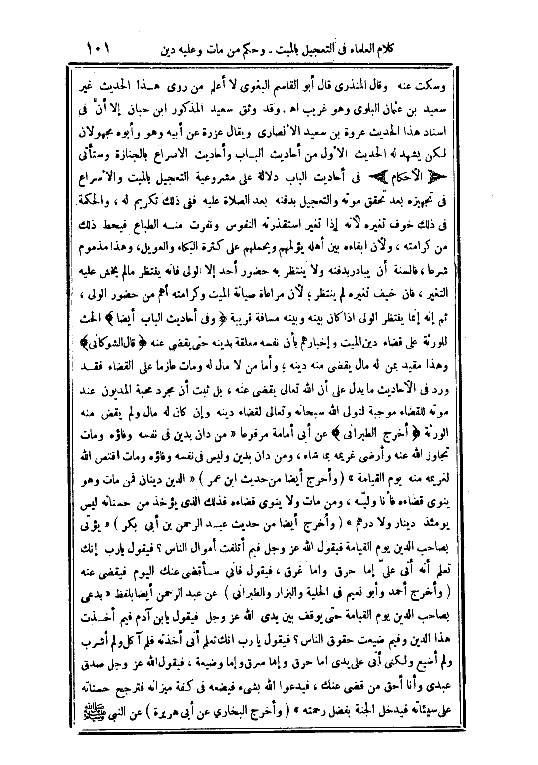وسكت عنه وقال المنذرى قال أبو القاسم البغوى لا أعلم من روى هذا الحديث غير سعيد بن عثمان البلوى وهو غريب اهـ. وقد وثق سعيد المذكور ابن حبان إلا أنَّ فى اسناد هذا الحديث عروة بن سعيد الأنصارى ويقال عزرة عن أبيه وهو وأبوه مجهولان لكن يشهد له الحديث الأول من أحاديث الباب وأحاديث الاسراع بالجنازة وستأتى (الأحكام) فى أحاديث الباب دلالة على مشروعية التعجيل بالميت والأسراع فى تجهيزه بعد تحقق موته والتعجيل بدفنه بعد الصلاة عليه ففى ذلك تكريم له، والحكمة فى ذلك خوف تغيره لأنه إذا تغير استقذرته النفوس ونفرت منه الطباع فيحط ذلك من كرامته، ولأن ابقاءه بين أهله يؤلمهم ويحملهم على كثرة البكاء والعويل، وهذا مذموم شرعا، فالسنه أن يبادر بدفنه ولا يتنظر به حضور أحد إلا الولى فانه ينتظر ما لم يخش عليه التغير، فان خيف تغيره لم يتنظر؛ لأن مراعاة صيانة الميت وكرامته أهم من حضور الولى، ثم إنه إنما ينتظر الولى اذا كان بينه وبينه مسافة قريبة (وفى أحاديث الباب أيضا) الحث للورثة على قضاء دين الميت وإخبارهم بأن نفسه معلقة بدينه حتى يقضى عنه (قال الشوكانى) وهذا مقيد بمن له يقضى منه دينه؛ وأما من لا مال له ومات على القضاء فقد ورد فى الأحاديث ما يدل على أن الله تعالى يقضى عنه، بل ثبت أن مجرد محبة المديون عند موته للقضاء موجبة لتولى الله سبحانه وتعالى لقضاء دينه وإن كان له مال ولم يقض منه الورثة (أخرج الطبرانى) عن أبى أمامة مرفوعا "من دان بدين فى نفسه وفاؤه ومات تجاوز اللهن هنه وأرض غريمه بما شاء، ومن دان بدين وليس فى نفسه وفاؤه ومات اقتص الله لغريمه منه يوم القيامة" (وأخرج أيضا من حديث ابن عمر) "الدين دينان فمن مات وهو ينوى قضاءه فأنا وليّه، ومن مات ولا ينوى قضاءه فذلك الذى يؤخذ من حسناته ليس يومئذ دينار ولا درهم" (وأخرج أيضا من حديث عبد الرحمن بن أبى بكر) "يؤتى بصاحب الدين يوم القيامة فيقول الله عز وجل فيم أتلفت أموال الناس؟ فيقول يارب إنك تعلم أنه أتى علىّ إما حرق واما غرق، فيقول فانى سأقضى عنك اليوم فيقضى عنه (وأخرج أحمد وأبو نعيم فى الحلية والبزار والطبرانى) عن عبد الرحمن أيضا بلفظ "بدعى بصاحب الدين يوم القيامة حتى يوقف بيد يدى الله عز وجل فيقول يابن آدم فيم أخذت هذا الدين وفيم ضيعت حقوق الناس؟ فيقول يارب انك تعلم أنى أخذته فلم آكل ولم أشرب ولم أضيع ولكنى أبى على يدى اما حرق وإما سرق وإما وضيعة، فيقول الله عز وجل صدق عبدى وأنا أحق من قضى عنك، فيدعوا الله بشئ فيضعه فى كفة ميزانه فترجح حسناته على سيئاته فيدخل الجنة بفضل رحمته" (وأخرج البخارى عن أبى هريرة) عن النبي صلى الله عليه وسلم