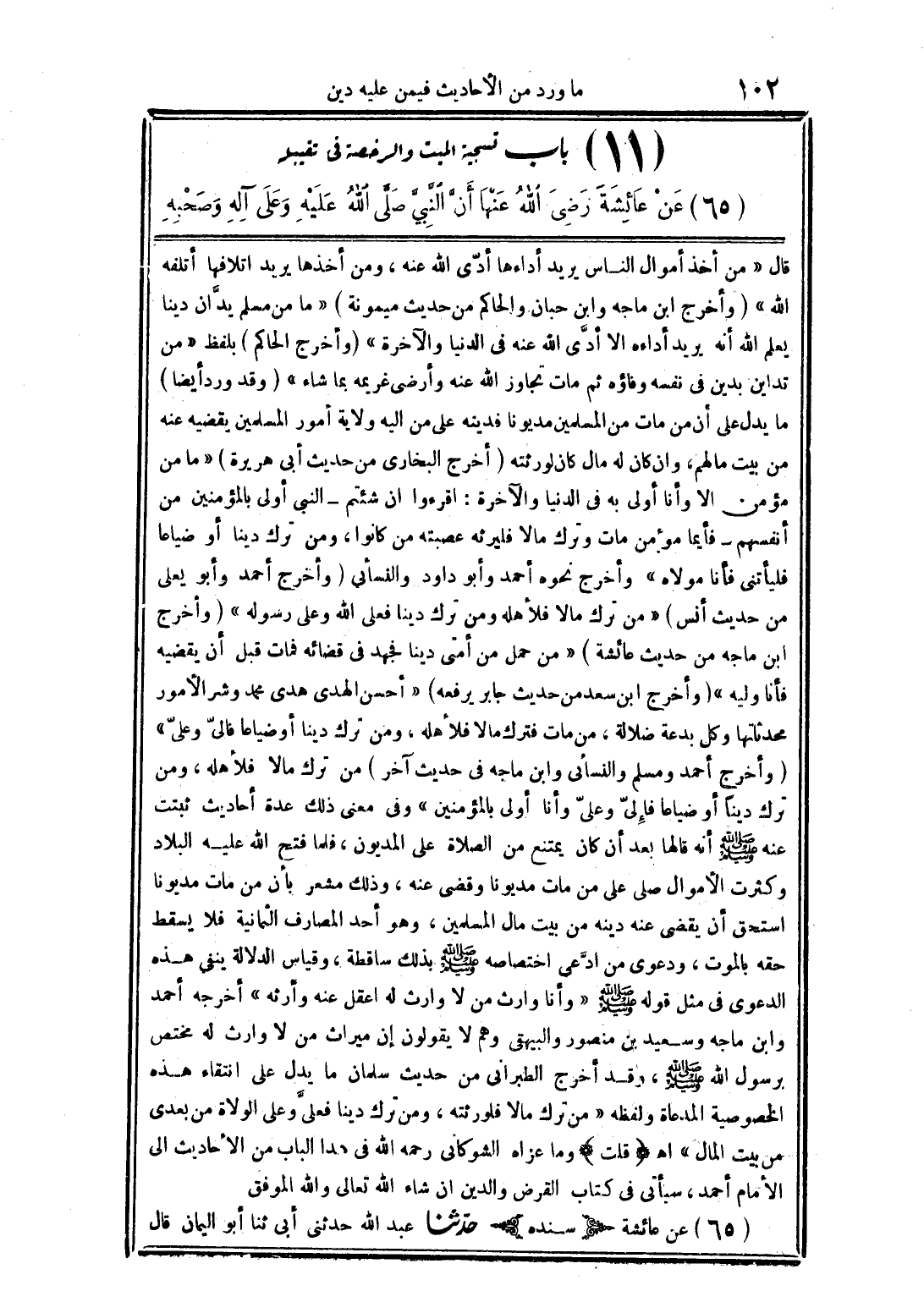 قال "من أخذ أموال الناس يريد أداءها أدّى الله عنه، ومن أخذها يريد اتلافها أتلفه الله" (وأخرج ابن ماجه وابن حباق والحاكم من حديث ميمونة) "ما من مسلم يدَّ ان دينا يعلم ان الله أنه يريد أداءه الا أدَّى الله عنه فى الدنيا والآخرة" (وأخرج الحاكم) بلفظ "من تداين بدين فى نفسه وفاؤه ثم مات تجاوز الله عنه وأرضى غريمه بما شاء" (وقد ورد أيضا) ما يدل على أن من مات من المسلمين مديونا فدينه على من اليه ولاية أمور المسلمين يقضيه عنه من بيت مالهم، وان كان له مال كان لورثته (أخرج البخارى من حديث أبى هريرة) "ما من مؤمن الا وأنا أولى به فى الدنيا والآخرة: اقرءوا ان شئتم - النبى أولى بالمؤمنين من أنفسهم - فأيما مؤمن مات وترك مالا فليرثه عصبته من كانوا، ومن ترك دينا أو ضياعا فليأتنى فأنا مولاه" وأخرج نحوه أحمد وأبو داود والنسائى (وأخرج أحمد وأبو يعلى من حديث أنس) "من ترك مالا فلأهله ومن ترك دينا فعلى الله وعلى رسوله" (وأخرج ابن ماجه من حديث عائشة) "من حمل من أمتى دينا فجهد فى قضائه فمات قبل أن يقضيه فأنا وليه" (وأخرج ابن سعد من حديث جابر يرفعه) "أحسن الهدى هدى محمد وشر الأمور محدثلتها وكل بدعة ضلالة، من مات فترك مالا فلأهله، ومن ترك دينا أو ضياعا فالىّ وعلىّ" (وأخرج أحمد ومسلم والنسائى وابن ماجه فى حديث آخر) من ترك مالا فلأهله، ومن ترك ديناً أو ضياعا فإلىّ وعلىّ وأنا أولى بالمؤمنين" وفى معنى ذلك عدة أحاديث ثبتت عنه صلى الله عليه وسلم أنه قالها بعد أن كان يمتنع من الصلاة على المديون، فلما فتح الله عليه البلاد وكثرت الأموال صلى على من مات مديونا وقضى عنه، وذلك مشعر بأن من مات مديونا استحق ان يقضى عنه دينه من بيت مال المسلمين، وهو أحد المصارف الثمانية فلا يسقط حقه بالموت، ودعوى من ادَّعى اختصاصه صلى الله عليه وسلم بذلك ساقطة، وقياس الدلالة ينفي هذه الدعوى فى مثل قوله صلى الله عليه وسلم "وأنا وارث من لا وارث له عقل عنه وأرثه" أخرجه أحمد وابن ماجه وسعيد بن منصور والبيهقى وهم لا يقولون إن ميراث من لا وارث له مختص برسول الله صلى الله عليه وسلم، وقد أخرج الطبرانى من حديث سلمان ما يدل على انتفاء هذه الخصوصية المدعاة ولفظه "من ترك مالا فلورثته، ومن ترك دينا فعلىَّ وعلى الولاة من بعدى من بيت المال" اهـ (قلت) وما عزاه الشوكانى رحمه الله فى هذا الباب من الأحاديث الى الأمام أحمد، سيأتى فى كتاب القرض والدين ان شاء الله تعالى والله الموفق
