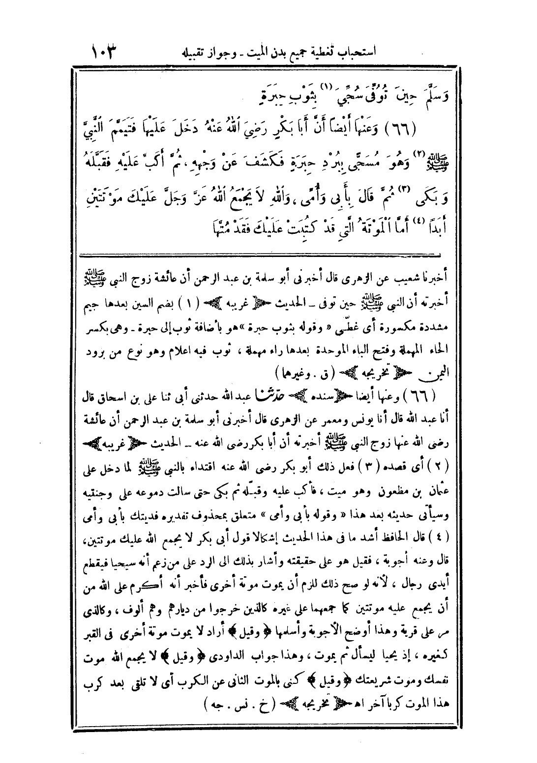 (66) وعنها أيضًا أن أبا بكر رضي الله عنه دخل عليها فتيمَّم النَّبيَّ صلَّى الله عليه وسلَّم (2) وهو مسجَّى ببرد حبرة فكشف عن وجهه، ثم أكب عليه فقبَّله وبكى (3) ثم قال بأبي وأمَّي، والله لا يجمع الله عزَّ وجلَّ عليك موتتين أبدًا (4) أما الموتة الَّتي قد كتبت عليك فقدمتها