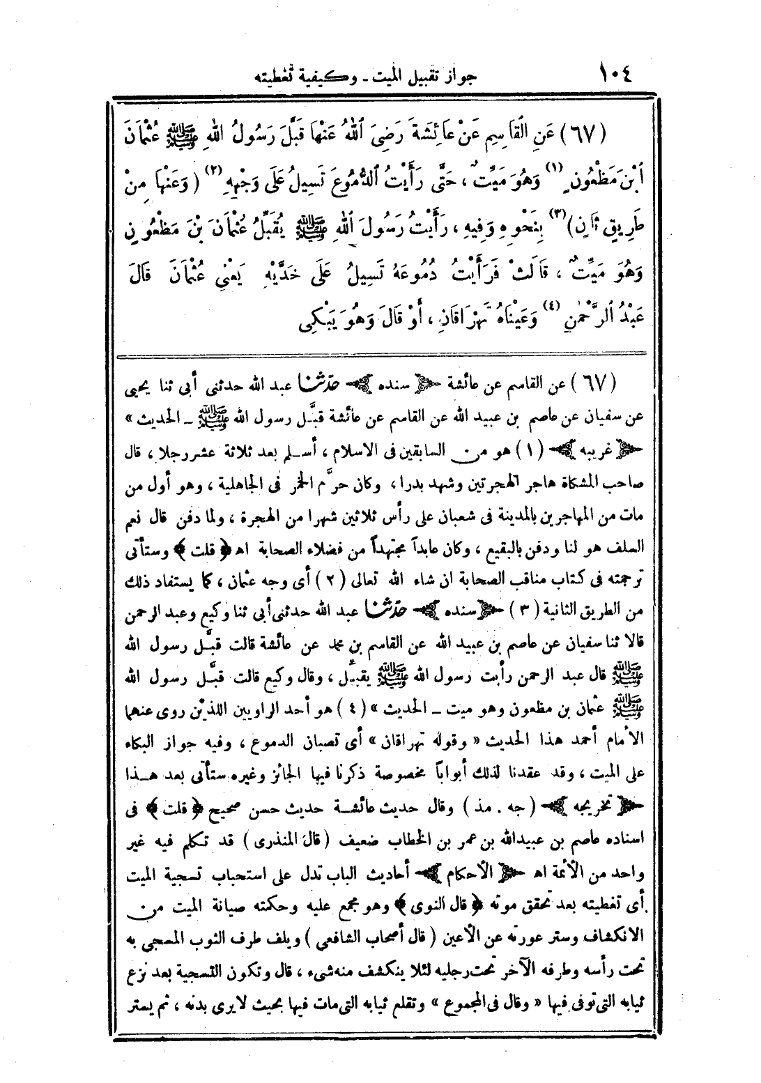 (67) عن القاسم عن عائشة رضي الله عنها قبَّل رسول الله صلَّى الله عليه وسلَّم عثمان ابن مظعون (1) وهو ميَّت، حتَّى رايت الدُّموع تسيل على وجهه (2) (وعنها من طريق ثان) (3) بنحوه وفيه، رأيت رسول الله صلَّى الله عليه وسلَّم يقبَّل عثمان بن مظعون وهو ميَّت، قالت فرأيت دموعه تسيل على خدَّيه يعني عثمان قال عبد الرحمن (4) وعيناه تهرقان، أو قال وهو يبكي
