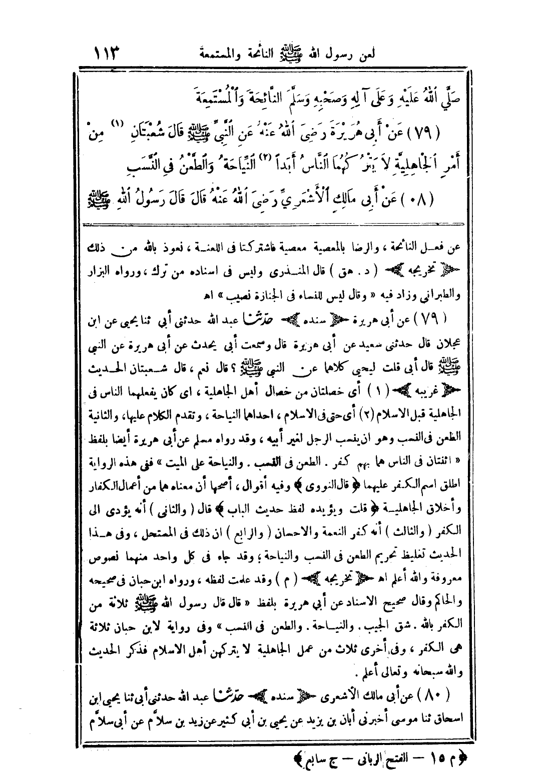(79) عن أبي هريرة رضي الله عنه عن النَّبيَّ صلَّى الله عليه وسلَّم قال شعبتان (1) من أمر الجاهليَّة لا يتركهما النَّاس أبدًا (2) النَّياحة والطَّعن في النَّسب