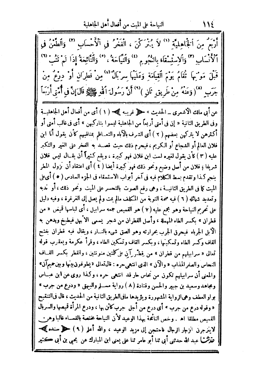 أربع من الجاهليَّة (1) لا يتركن، الفخر في الأحساب (2) والطَّعن في الأنساب (3) والاستسقاء بالنجوم (4) والنَّياحة، (5) والنَّائحة إذا لم تتب (6) قبل موتها تقام يوم القيامة وعليها سر بال (7) من قطران أو درع من جرب (8) (وعنه من طريق ثان) (9) أنَّ رسول الله صلي الله عليه وسلَّم قال إنَّ في أمَّتي أربعًا