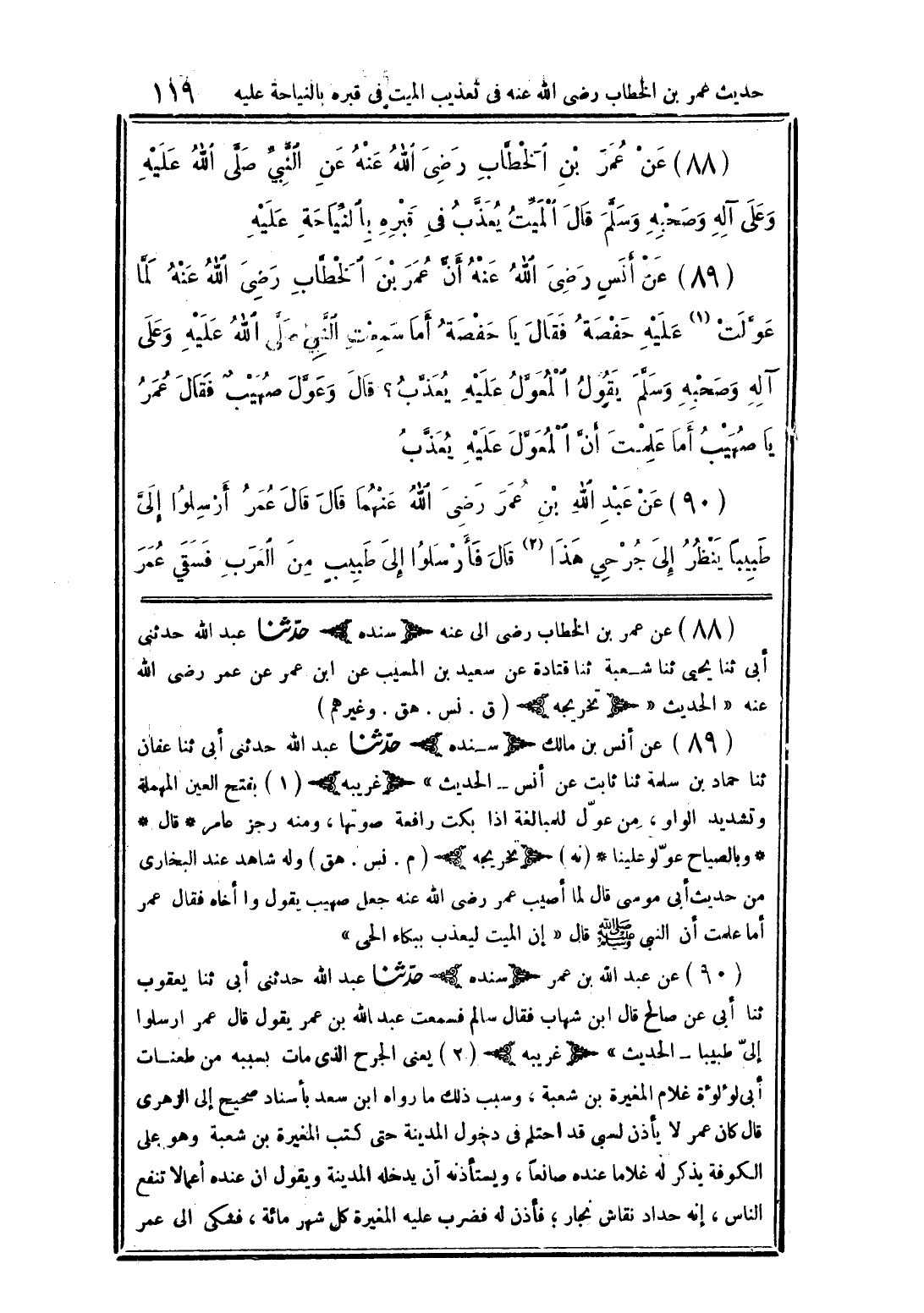 (89) عن أنس رضي الله عنه أنَّ عنر بن الخطَّاب رضي الله عنه لمَّا عوَّلت (1) عليه حفصة فقال يا حفصة أما سمعت النَّبيَّ صلَّى الله عليه وعلى آله وصحبه وسلَّم يقول المعوَّل عليه يعذَّب؟ قال وعوَّل صهيب فقال عمر يا صهيب أما علمت أنَّ المعوَّل عليه يعذَّب