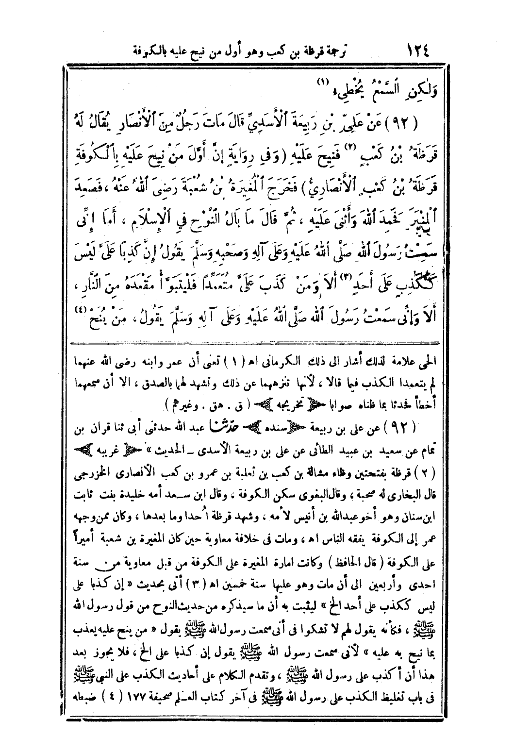 (92) عن على بن ربيعة (سنده) حدّثنا عبد الله حدثنى أبى ثنا قران بن تمام عن سعيد بن عبيد الطائى عن على بن ربيعة الأسدى - الحديث" (غريبة) (2) قرظة بفتحتين وظاء مشالة بن كعب بن ثعلبة بن عمرو بن كعب الأنصارى الخزرجى قال البخارى له صحبة، وقال البغوى سكنالكوفة، وقال ابن سعد أمه خليدة بنت ثابت ابن سنان وهو أخو عبد الله بن أنيس لأمه، وشهد قرظة احدا وما بعدها، وكان ممن وجهه عمر إلى الكوفة يفقه الناس اهـ، ومات فى خلافة معاوية حين كان المغيرة بن شعبة أميرًا على الكوفة (قال الحافظ) وكانت امارة المغيرة على الكوفة من قبل معاوية من سنة احدى وأربعين الى أن مات وهو عليها سنة خمسين اهـ (3) أتى بحديث "إن كذبا على ليس ككذب على أحد اله" ليثبت به أن ما سيذكره من حديث النوح من قول رسول الله صلى الله عليه وسلم، فكأنه يقول لهم لا تشكوا فى أنى سمعت رسول الله صلى الله عليه وسلم يقول "من ينح عليه يعذب بما نبح به عليه" لأنى سمعت رسول الله صلى الله عليه وسلم يقول ان كذبا على الخ، فلا يجوز بعد هذا أن أكذب على رسول الله صلى الله عليه وسلم، وتقدم الكلام على أحاديث الكذب على النهى صلى الله عليه وسلم فى باب تغليظ الكذب على رسول الله صلى الله عليه وسلم فى آخر كتاب العلم صحيفة 177 (4) ضبطه