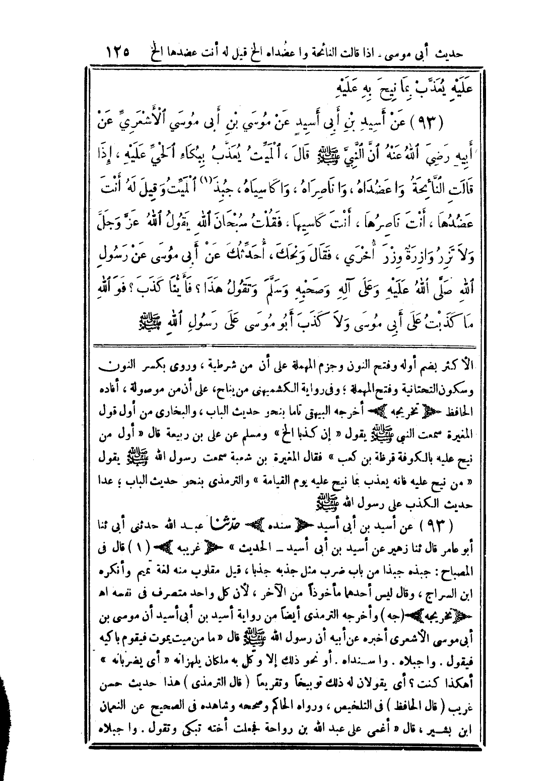 عن أسيد بن أبي أسيد عن موسى بن أبي موسى الأشعري عن أبيه رضي الله عنه أن النبي (صلى الله عليه وسلم) قال، ألميت يعذب ببكاء الحي عليه، إذا قالت النائحة وا عضداه، وا ناصراه، وا كاسياه، جبذ (1) الميت وقيل له أنت عضدها، أنت ناصرها، أنت كاسيها، فقلت سبحان الله يقول الله عز وجل ولا تزر وازرة وزر أخرى، فقال ونحك، أحدثك عن أبي موسى عن رسول الله صلى الله عليه وعلى آله وصحبه وسلم وتقول هذا؟ فأينا كذب؟ فو الله ما كذبت على أبي موسى ولا كذب أبو موسى على رسول الله (صلى الله عليه وسلم)