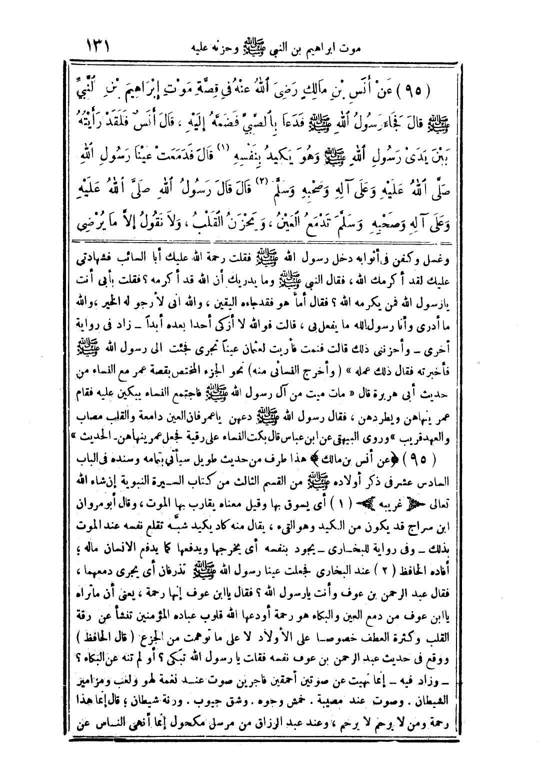 (95) (عن أنس بن مالك) هذا طرف من حديث طويل سيأتي بتمامه وسنده فى الباب السادس عشر فى ذكر أولاده صلى الله عليه وسلم من القسم الثالث من كتاب السيرة النبوية إن شاء الله تعالى (غريبه) (1) أى يسوق بها وقيل معناه يقارب بها الموت، وقال أبو مروان ابن سراج قد يكون من الكيد وهو القئ، يقال منه كاد يكبد شبَّه تقلع نفسه عند الموت بذلك - وفى رواية للبخارى - يجود بنفسه أى يخرجها ويدفعها كما يدفع الانسان دمعها، فقال عبد الرحمن بن عوف وأنت يا رسول الله؟ فقال يا ابن عوف إنها رحمة، يعنى أن ما تراه يا ابن عوف من دمع العين والبكاء هو رحمة أودعها اللع قلوب عباده المؤمنين تنشأ عن رثة القلب وكثرة العطف خصوصا على الأولاد لا على ما توهمت من الجزع (قال الحافظ) ووقى فى حديث عبد الرحمن بن عوف نفسه فقلت يا رسول الله تبكى؟ أو ل تنه عن البكاء؟ وزاد فيه - إنما نهيت عن صوتين أحمقين فاجرين صوت عند نغمة لهو ولعب ومزامير الشيطان. وصوت عند مصيبة. خمش وجوه. وشق جيوب. ورنة شيطان؛ قال إنما هذا رحمة ومن لا يرحم لا يرحم، وعند عبد الرازق من مرسل مكحول إنما أنهى الناس عن