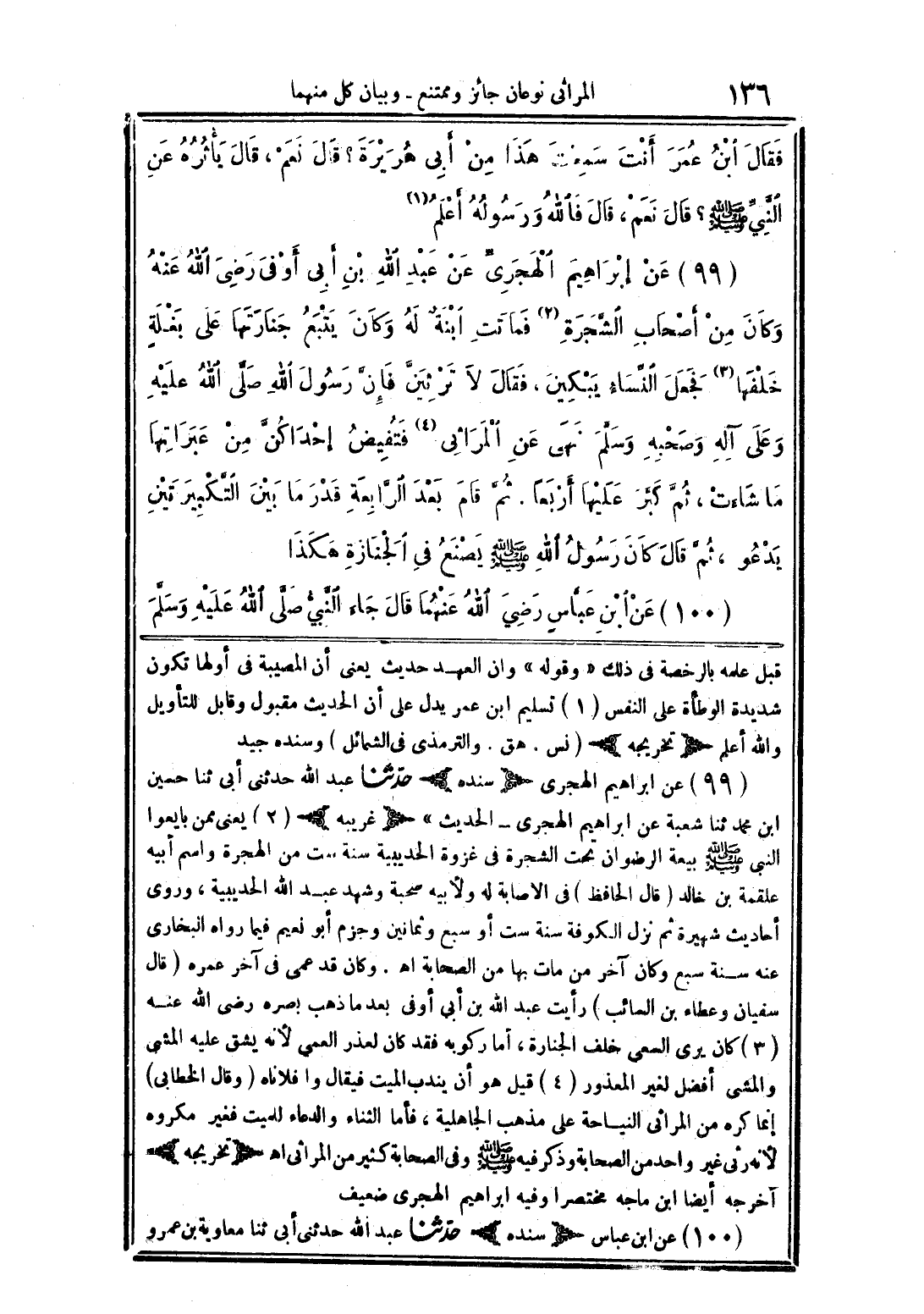 (99) عن ابراهيم الهجرى (سنده) حدّثنا عبد الله حدثنى أبى ثنا حسين ابن محمد ثنا شعبة عن ابراهيم الهجرى - الحديث" (غريبه) (2) يعنى ممن بايعوا النبى صلى الله عليه وسلم بيعة الرضوان تحت الشجرة فى غزوة الحديبيبة سنة ست من الهجرة واسم أبيه علقمة بن خالد (قال الحافظ) فى الاصابة له ولأبيه صحبة وشهد عبد الله الحديبية، وروى أحاديث شهيرة ثم نزل الكوفة سنة ست أو سبع وثمانين وجزم أبو نعيم فيما رواه البخارى عنه سنة سبع وكان آخر من مات بها من الصحابة اهـ. وكان قد عمى فى آخره عمره (قال سفيان وعطاء بن الصائب) رأيت عبد الله بن أبى أوفى بعدما ذهب بصره رضى الله عنه (3) كان يرى السعى خلف الجنازة، أما ركوبه فقد كان لعذر العمي لأنه يشق عليه المشى والمشى أفضل لغير المعذور (4) قيل هو أن يندب الميا فيقال وا فلاناه (وقال الخطابى) إنما كره من المرائلا النياحة على مذهب الجاهلية، فأما الثناء والدعاء للميت فغير مكروه لأنه رئى غير واحد من الصحابة وذكر فيه صلى الله عليه وسلم وفى الصحابة كثير من المرائى اهـ (تخريجه) آخرجه أيضا ابن ماجه مختصرا وفيه ابراهيم الهجرى ضعيف