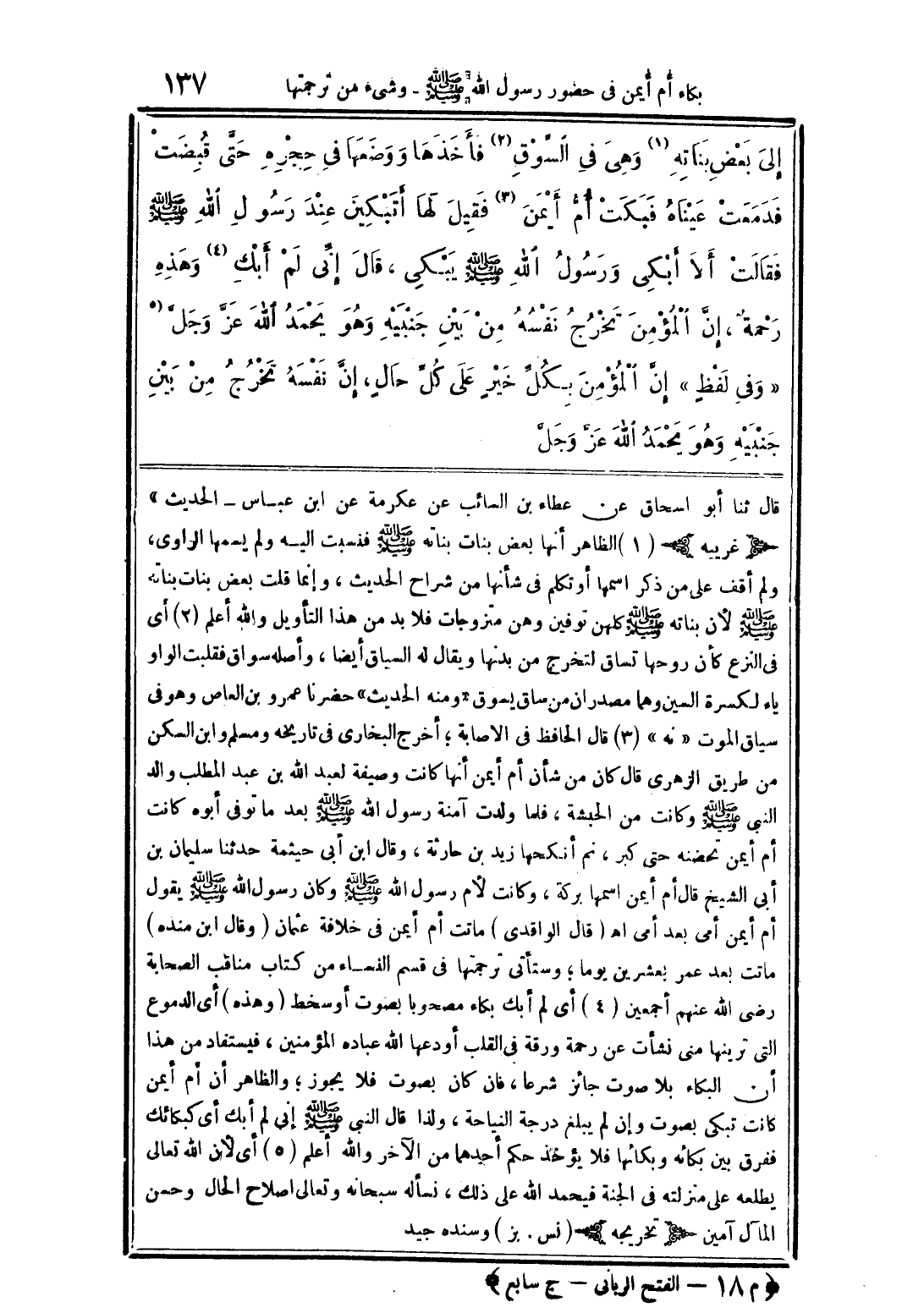 إلى بعض بناته (1) وهي في السوق (2) فأخذها ووضعها في حجره حتى قبضت فدمعت عيناه فبكت أم أيمن (3) فقيل لها أتبكين عند رسول الله (صلى الله عليه وسلم) فقالت ألا أبكى ورسول الله (صلى الله عليه وسلم) يبكي، قال إني لم أبك (4) وهذه رحمة، إن المؤمن تخرج نفسه من بين جنبيه وهو يحمد الله عز وجل (5) (وفي لفظ) إن المؤمن بكل خير على كل حال، إن نفسه تخرج من بين جنبيه وهو يحمد الله عز وجل