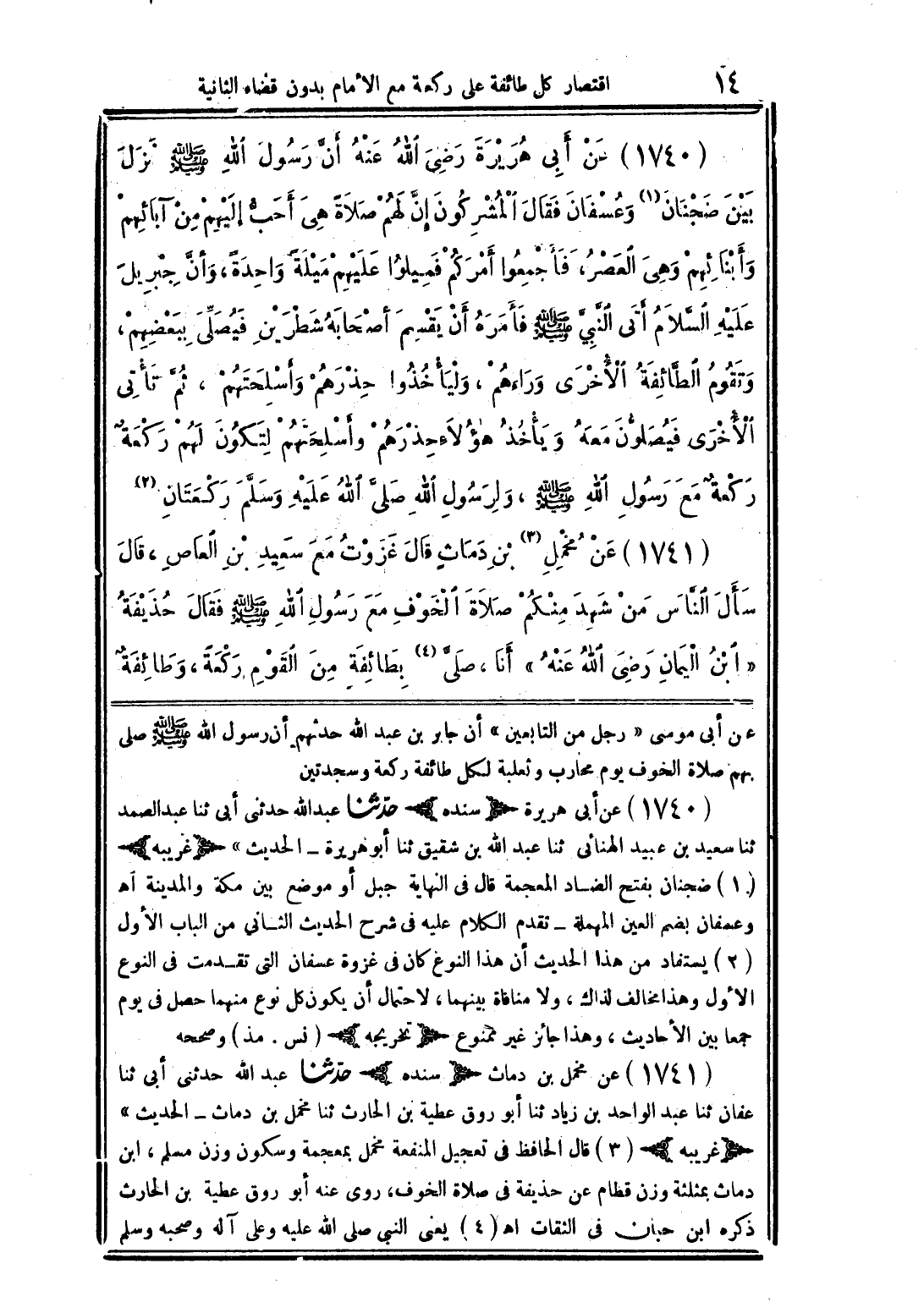 (1740) عن أبي هريرة رضي الله عنه أنَّ رسول الله صلى الله عليه وسلم نزل بين ضجنان وعسفان فقال المشركون إن لهم صلاة هي أحب إليهم من آبائهم وأبنائهم وهي الصر، فأجمعوا أمركم فميلوا عليهم ميلة واحدة، وأمَّ جبريل عليه السلام أتى النَّبيِّ صلى الله عليه وسلم فأمره أن يقسم أصحابه شطرين فيصلَّي ببعضهم، وتقوم الطَّائفة الأخرى وراءهم، وليأخذوا حذرهم وأسلحتهم، ثمَّ تأتي الأخرى فيصلون معه ويأخذ هؤلاء حذرهم وأسلحتهم لتكون لهم ركعة ركعة مع رسول الله صلى الله عليه وسلم، ولرسول الله صلَّى الله عليه وسلم ركعتان.