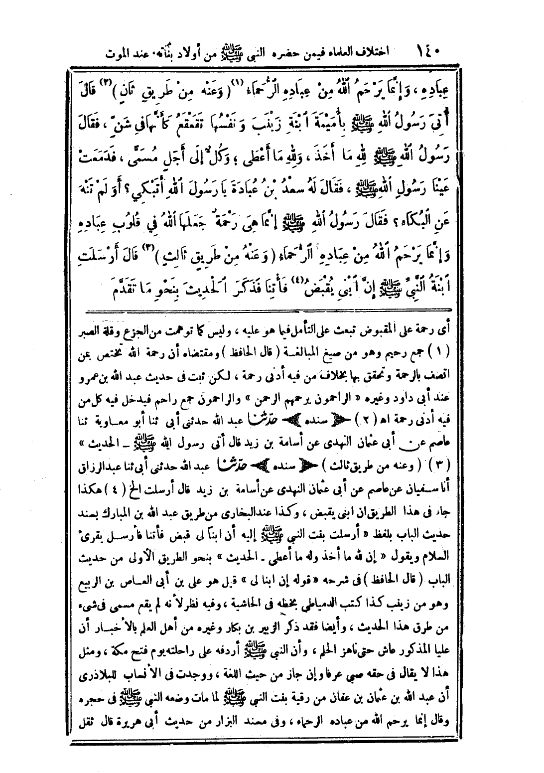 أي رحمة على المقبوض تبعق على التأمل فيما هو عليه، وليس كما توهمت من الجزع وقلة الصبر (1) جمع رحيم وهو من صيغ المبالغة (قال الحافظ) ومقتضاه أن رحمة الله تختص بمن اتصف بالرحمة وتحقق بها بخلاف من فيه أدنى رحمة، لكن ثبت فى حديث عبد الله بن عمرو عند أبى داود وغيره "الراحمون يرحمهم الرحمن" والراحمون جمع راحم فيدخل فيه كل من فيه أدنى رحمة اهـ (2) (سنده) حدّثنا عبد الله حدثنى أبى ثنا أبو معاوية ثنا عاصم عن أبى عثمان النهدى عن أسامة بن زيد قال أتى رسول الله صلى الله عليه وسلم - الحديث" (3) (وعنه من طريق ثالث) (سنده) حدّثنا عبد الله حدثنى أبى ثنا عبد الرازق أنا سفيان عن عاصم عن أبى عثمان النهدى عن أسامة بن زيد قال أرسلت الخ (4) هكذا جاء فى هذا الطريق ان ابنى يقبض، وكذا عند البخارى من طريق عبد الله بن المبارك بسند حديث الباب بلفظ "أرسلت بنت النبى صلى الله عليه وسلم إليه أن ابنًا لى قبض فأتنا فأرسل يقرئ السلام ويقول "إن لله ما أخذ وله ما أعطى - الحديث" بنحو الطريق الأولى من حديث الباب (قال الحافظ) فى شرحه "قوله إن ابنا لى" قيل هو على بن أبى العاص بن الربيع وهو من زينب كذا كتب الدمياطي بخطه فى الحاشية، وفيه نظر لأنه لم يقع مسمى فى شئ من طرق هذا الحديث، وأيضا فقد ذكر الزبير بن بكار وغيره من أهل العلم بالأخبار أن عليا المذكور عاش حتى ناهز الحلم، وأن النبى صلى الله عليه وسلم أردفه على راحلته يوم فتح مكة، ومثل هذا لا يقال فى حقه صبى عرقا وإن جاز من حيث اللغة، ووجدت فى الأنساب للبلاذرى أن عبد الله بن عثمان بن عفان من رقية بنت النبى صلى الله عليه وسلم لما مات وضعه النبى صلى الله عليه وسلم فى حجره وقال إنما يرحم الله من عباده الرحماء، وفى مسند من حديث أبى هريرة قال ثقل