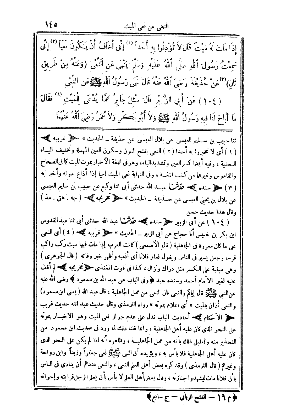 (1) أى لا تخبروا به أحدا (2) النعى بفتح النون وسكون العين المهملة وتخفيف الياء التحتية، وفيه أيضا كسر العين وتشديد يد الياء، وهو فى الغة الأخبار بموت الميت كما فى الصحاح والقاموس وغيرهما من كتب اللغة، وفى النهاية نعى الميت نعيا إذا أذاع موته وأخبر به (3) (سنده) حدّثنا عبد الله حدثنى أبى ثنا وكيع عن حبيب بن سليم العبسى عن بلال بن يحيى العبسى عن حذيفة - الحديث" (تخريجه) (جه. هق. مذ) وقال هذا حديث حسن