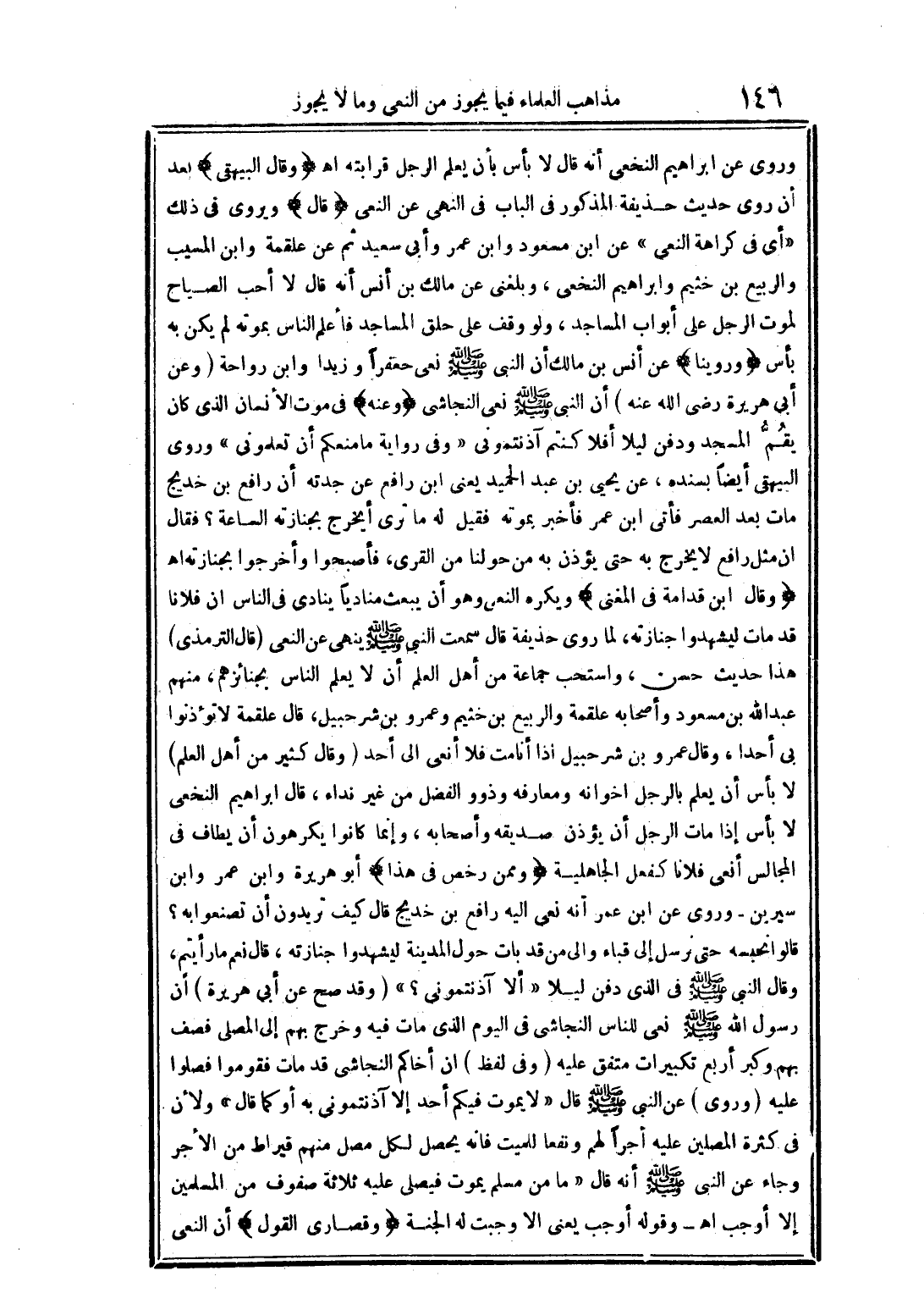 وروي عن إبراهيم النخعى أنه قال لا بأس بأن يعلم الرجل قرابته اهـ (وقال البهقى) بعد أن روى حديث حذيفة المذكور فى الباب فى النهى عن النعى (قال) ويروى فى ذلك "أى فى كراهة النعى" عن ابن مسعود وابن عمر وأبى سعيد ثم عن علقمة وابن المسيب والربيع بن خثيم وابراهيم النخعى، وبلغنى عن مالك بن أنس أنه قال لا أحب الصياح لموت الرجل على أبواب المساجد، ولو وقف على حلق المساجد فأعلم الناس بموته لم يكن به بأس (وروينا) عن أنس بن مالك أن النبى صلى الله عليه وسلم نعى جعفرًا وزيدا وابن رواحة (وعن أبى هريرة رضى الله عنه) أن النبى صلى الله عليه وسلم نعى النجاشى (وعنه) فى موت الأنسان الذى كان يقمُّ المسجد ودفن ليلا أفلا كنتم آذنتمونى "وفى رواية ما منعكم أن تعلمونى" وروى البيهقى أيضًا بسنده، عن يحيى بن عبد الحميد يعنى ابن رافع عن جدته أن رافع بن خديج مات بعد العصر فأتى ابن عمر فأخبر بموته فقيل له ما ترى أيخرج بجنازته الساعة؟ فقال ان مثل رافعلا يخرج به حتى يؤذن به من حولنا من القرى، فأصبحوا وأخرجوا بجنازته اهـ (وقال ابن قدامة فى المغنى) ويكره النعى وهو أن يبعث مناديًا ينادى فى الناس ان فلانا قد مات ليشهدوا جنازته، لما روى حذيفة قال سمعت النبى رسول الله صلى الله عليه وسلم ينهى عن النعى (قال الترمذى) هذا حديث حسن، واستحب جماعة من أهل العلم أن لا يعلم الناس بجنائزهم، منهم عبد الله بن مسعود وأصحابه علقمة والربيع بن خثيم وعمرو لم شرحبيل، قال علقمة لا تؤذوا بى أحدا، وقال عمرو بن شرحبيل أذا أنامت فلا أنعى الى أحد (وقال كثير من أهل العلم) لا بأس أن يعلم بالرجل اخوانه ومعارفه وذوو الفضل من غير نداء، وقال ابراهيم النخعى لا بأس إذا مات الرجل أن يؤذن صديقه وأصحابه، وإنما يكون يكرهون أن يطاف فى المجالس أنعى فلانا كفعل الجاهلية (وممن رخص فى هذا) أبو هريرة وابن عمر وابن سيرين - وروى عن ابن عمر أنه نعى اليه رافع بن خديج قال كيف تريدون أن تصنعوا به؟ قال نحبسه حتى نوسل إلى قباء والى من قد بات حول المدينة ليشهدوا جنازته، قال نعم ما رأيتم. وقال النبى صلى الله عليه وسلم فى الذى دفن ليلا "ألا آذنتمونى؟ " (وقد صح عن أبى هريرة) أن رسول الله صلى الله عليه وسلم نعى للناس النجاشى فى اليوم الذى مات فيه وخرج بهم إلى المصلى فصف بهم وكبر أربع تكبيرات متفق عليهم (وفى لفظ) أن أخاكم النجاشى قد مات فقوموا فصلوا عليه (وروى) عن النبى صلى الله عليه وسلم قال "لا يموت فيكم أحد إلا آذنتمونى به أو كما قال" ولأن فى كثرة المصلين عليه أجرًا لهم ونفعا للميت فانه يحصل لكم مصل منهم قيراط من الأجر وجاء عن النبى صلى الله عليه وسلم أنه قال "ما من مسلم يموت فيصلى عليه ثلاثة صفوف من المسلمين إلا أوجب اهـ وقوله أوجب يعنى الا وجبت له الجنة (وقصارى القول) أن النعي