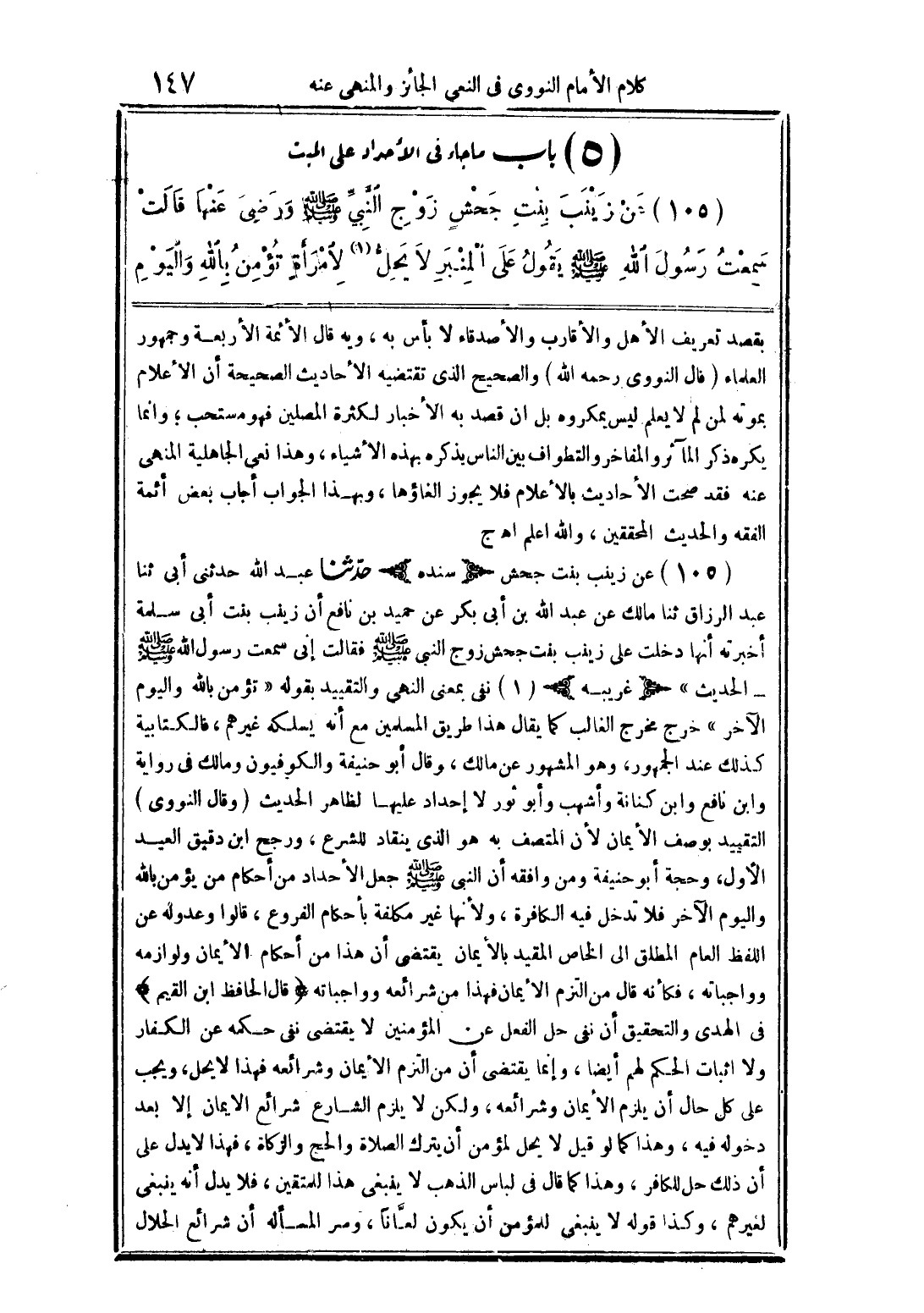 عن زينب بنت جحش زوج النبي (صلى الله عليه وسلم) ورضي عنها قالت سمعت رسول الله (صلى الله عليه وسلم) يقول على المنبر لا يحل (1) لامرأة تؤمن بالله واليوم
