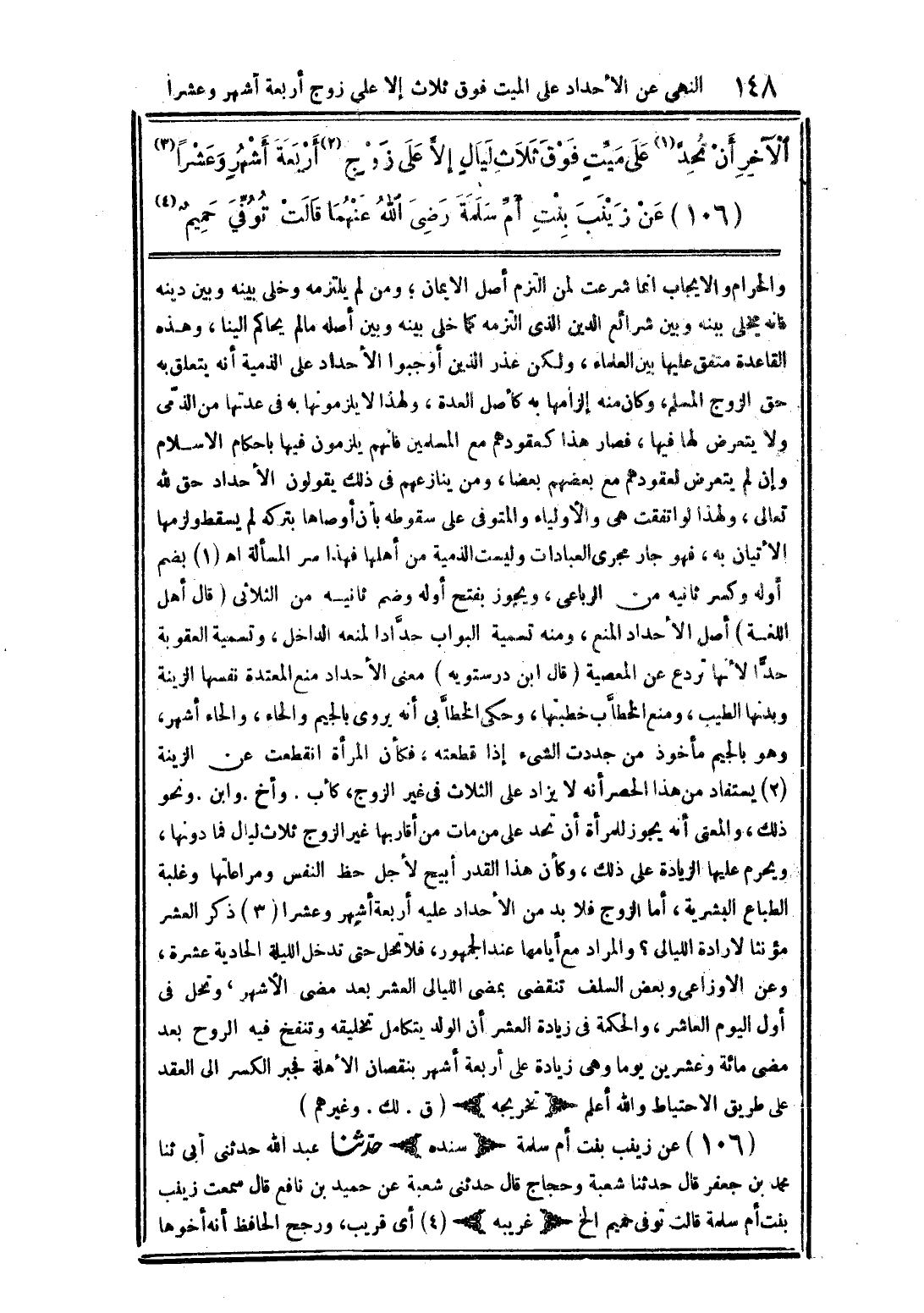 والحرام والايجاب انما شرعت لمن التزم أصل الايمان؛ ومن لم يلتزمه وخلى بينه وبين دينه فانه يخلى بينه وبين شرائع الدين الذى التزمه كما خلى بينه وبين أصله ما لم يحاكم الينا، وهذه القاعدة متفق عليها بين العلماء، ولكن عذر الذين أوجبوا الأحداد على الذمية أنه يتعلق به حق الزوج المسلم، وكان منه إلزامها به كأصل العدة، ولهذا لا يلزمونها به فى عدتها من الذّمى ولا يتعرض لها فيها، فصار هذا كعقودهم مع المسلمين فانهم يلزمون فيها باحكام الاسلام وإن لم يتعرض لعقودهم هى والأولياء والمتوفى على سقوطه بأن أوصاها بتركه لم يسقط ولزمها الأتيان به، فهو جا مجرى العبادات وليست الذمية من أهلها فهذا سر المسألة اهـ (1) بضم اوله وكسر ثانيه من الرباعى، ويجوز بفتح أوله وضم ثانيه من الثلاثى (قال أهل اللغة) أصل الأحداد المنع، ومنه تسمية البواب حدَّاد لمنعه الداخل، وتسمية العقوبة حدِّا لأنها تردع عن المعصية (قال ابن درستويه) معنى الأحداد منع المعتدة نفسها الزينة وبدنها الطيب، ومنع الخطاَّب خطبتها، وحكى الخطاَّبى أنه يروى بالجيم والحاء، والحاء أشهر، وهو بالجيم مأخوذ من جددت الشئ إذا قطعته، فكأن المرأة انقطعت عن الزينة (2) يستفاد من هذا الحصر أنه لا يزد على الثلاث فى غير الزوج، كأب. وأخ. وابن. ونحو ذلك، والمعنى أنه يجوز للمرأة أن تحد على من مات من أقاربها غير الزوج ثلاث ليال فما دونها، ويحرم عليها الزيادة على ذلك، وكأن هذا القدر أبيح لأجل حظ النفس ومراعاتها وغلبة الطباع البشرية، أما الزوج فلا بد من الأحداد عليه أربعة أشهر وعشرا (3) ذكر العشر مؤنثا لارادة الليالى؟ والرماد مع أيامها عند الجمهور، فلا تحل حتى ندخل الليلة الحادية عشرة، وعن الاوزاعى وبعض السلف تنقضى بمضى الليالى العشر بعد مضى الأشهر، وتحل فى أول اليوم العاشر، والحكمة فى زيادة العشر أن الولد يتكامل تخليقه وتنفخ فيه الروح بعد مشى مائة وعشرين يوما وهى بزيادة على أربعة أشهر بنقصات الأهلة فجبر الكسر الة العقد على طريق الاحتياط والله أعلم (تخريجه) (ق. لك. وغيرهم)